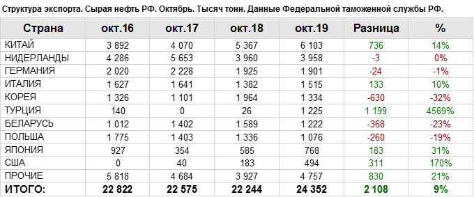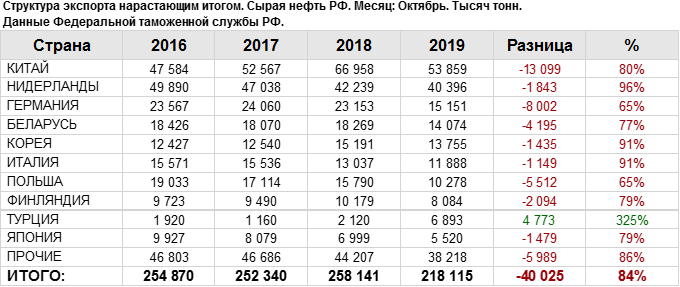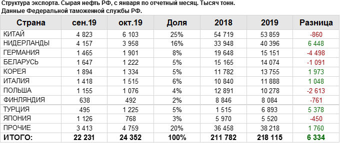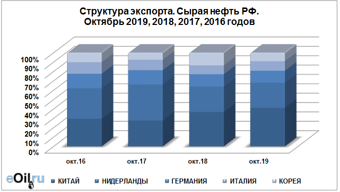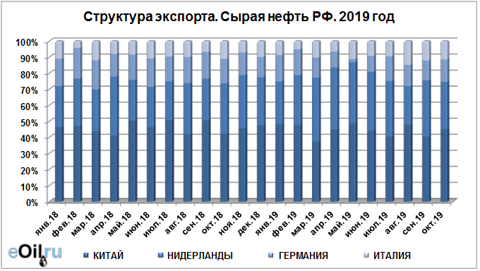 Структура экспорта сырой нефти из России с января 2019 по октябрь 2019