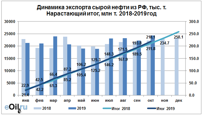 В 2019 году объем поставок сырой нефти на экспорт достиг 218115.31 тыс. тонн. Данный объем на текущий момент составляет 84% от объема прошлого 2018 года.