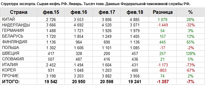 В феврале 2018 года общий объем экспорта сырой нефти составил: 19241.17 тыс. тонн.