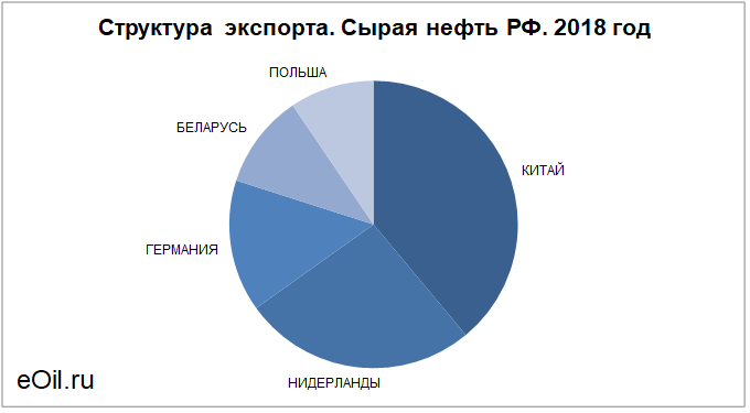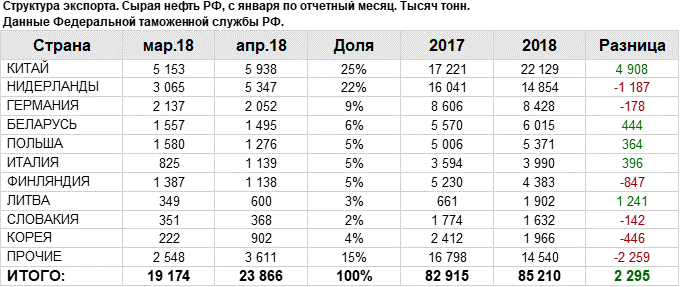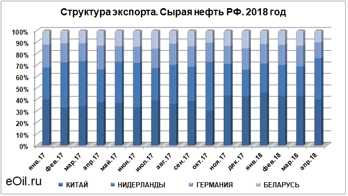 Структура экспорта сырой нефти из России с января по апрель 2018