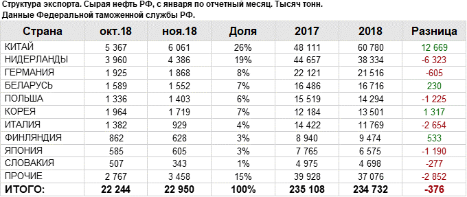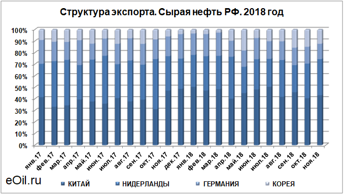 Структура экспорта сырой нефти из России с января по ноябрь 2018