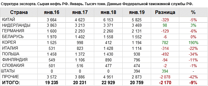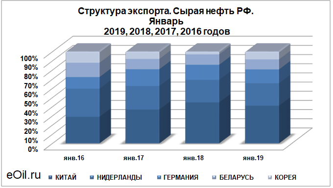 Структура экспорта сырой нефти из России. Январь 2019