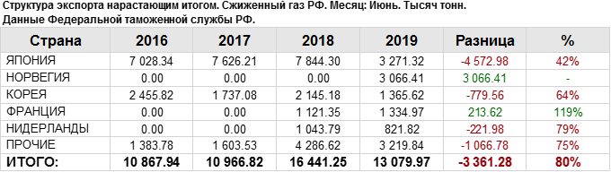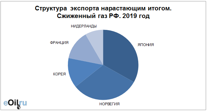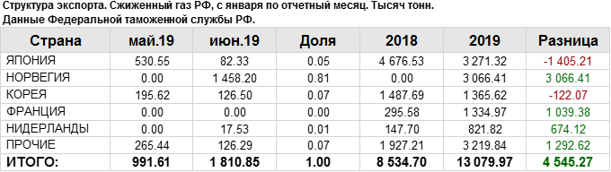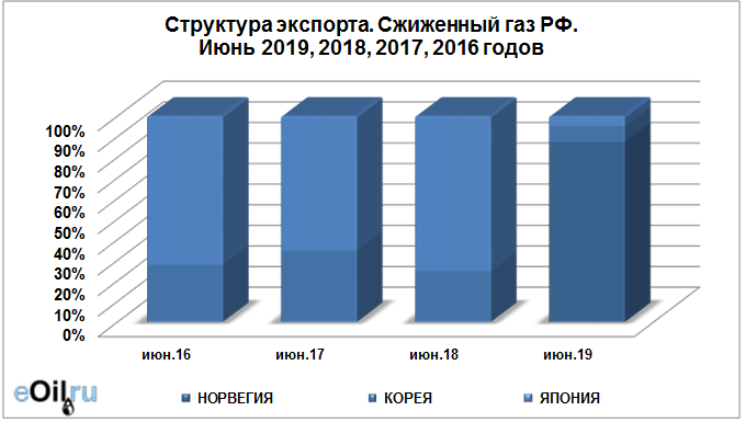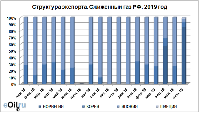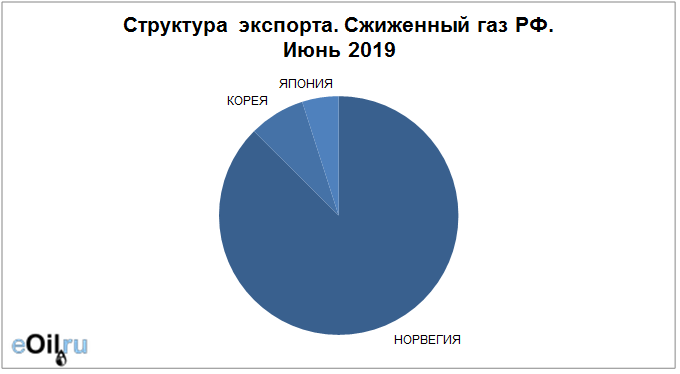 Структура экспорта сжиженного газа из России. Данные на июнь 2019