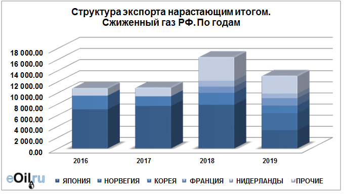 Структура экспорта сжиженного газа из России нарастающим итогом по годам