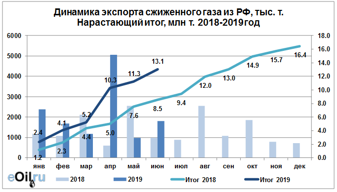 В 2019 году объем поставок сжиженного газа на экспорт достиг 13079.97 тыс. тонн. Данный объем на текущий момент составляет 80% от объема прошлого 2018 года.