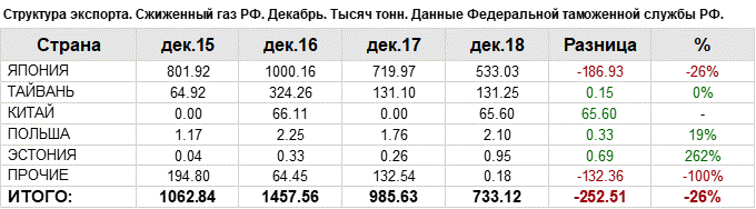 В декабре 2018 года общий объем экспорта сжиженного газа составил: 733.12 тыс. тонн.