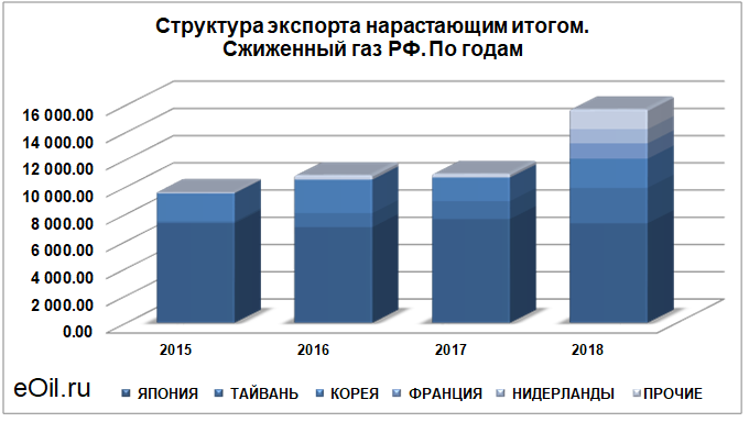 Структура экспорта сжиженного газа из России нарастающим итогом по годам