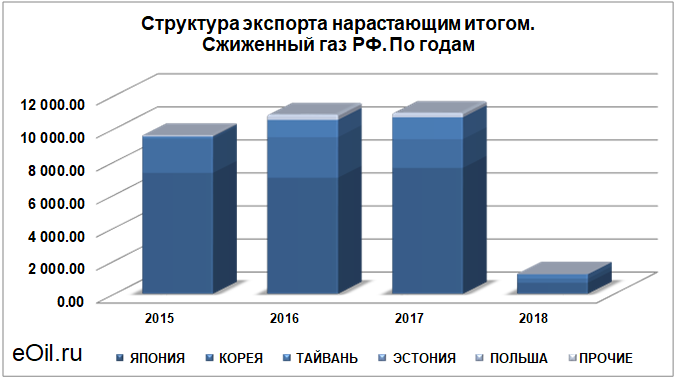Структура экспорта сжиженного газа из России нарастающим итогом по годам