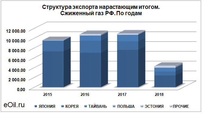Структура экспорта сжиженного газа из России нарастающим итогом по годам
