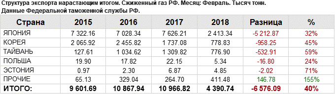 В 2018 году объем поставок сжиженного газа на экспорт достиг 4390.74 тыс. тонн. Данный объем на текущий момент составляет 40% от объема прошлого 2017 года.
