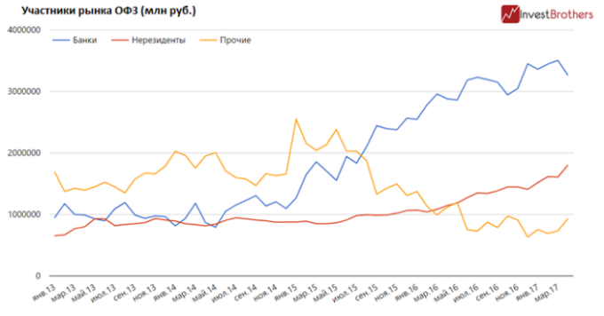 2.Российские банки продают ОФЗ, в то время как нерезиденты и прочие участники рынка покупают.
