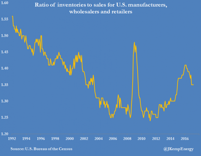 Согласно данным Бюро переписи населения США, соотношение количества товарно-материальных запасов к количеству продаж увеличилось со значения 1,28 в январе 2013 года до значения 1,41 в марте 2016 года.