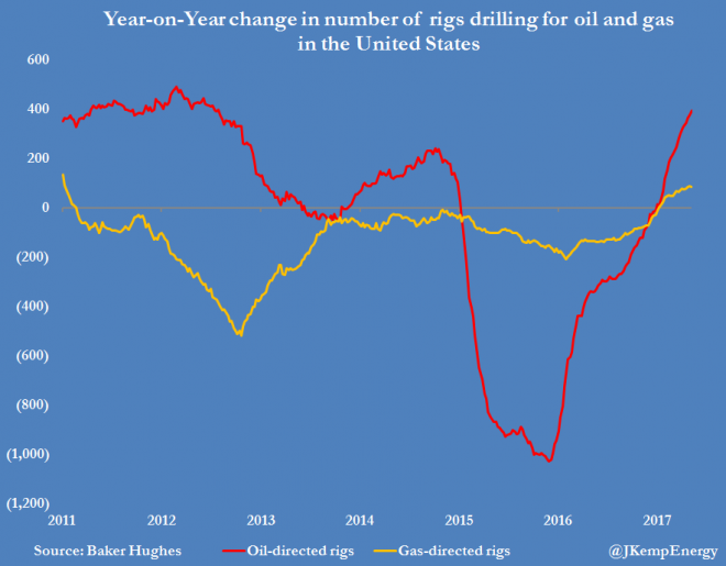 По подсчетам нефтесервисной компании Baker Hughes, количество нефтяных и газовых вышек увеличилось с 400 (по состоянию на май 2016 года) до 900.