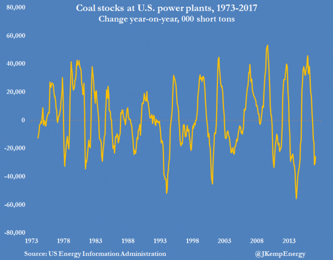 Однако, в сентябре 2016 года запасы угля сократились до нормальных показателей. При этом, в ответ на увеличение цен на природный газ, возросли объемы потребления угля.