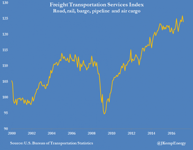 Большая часть грузов перевозится транспортом, который работает на дизельных двигателях, либо, в случае с воздушным транспортом, на реактивных турбинах. Соответственно, перевозка грузов является главным источником увеличения потребления дистиллятного топлива и реактивного топлива.