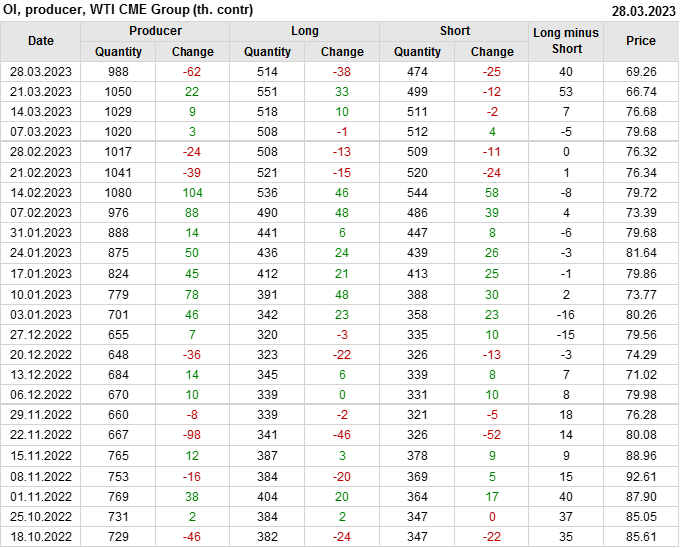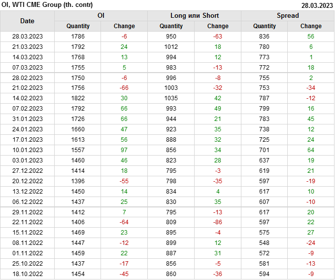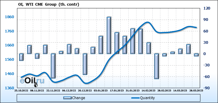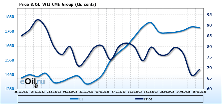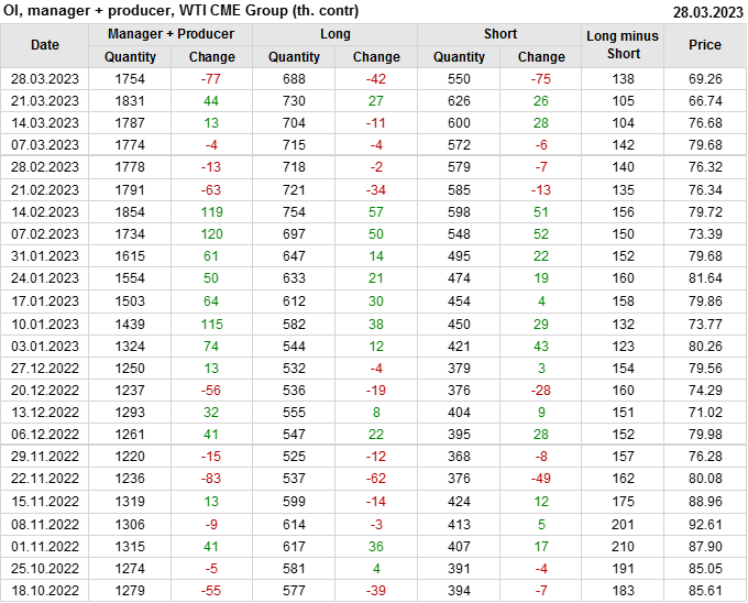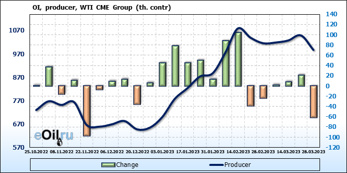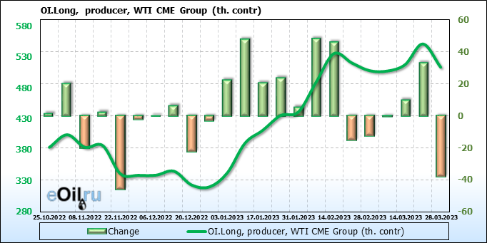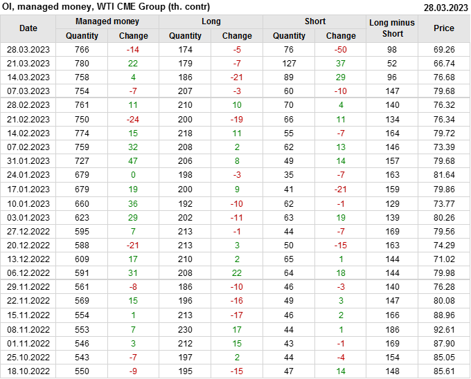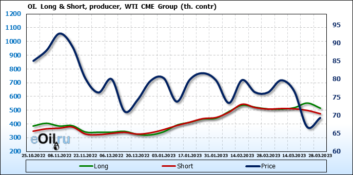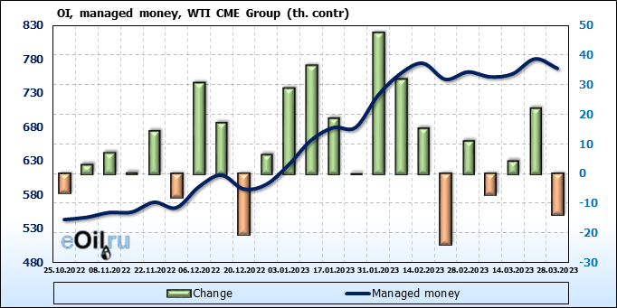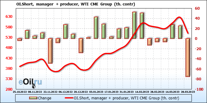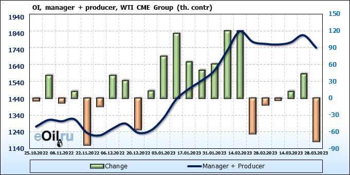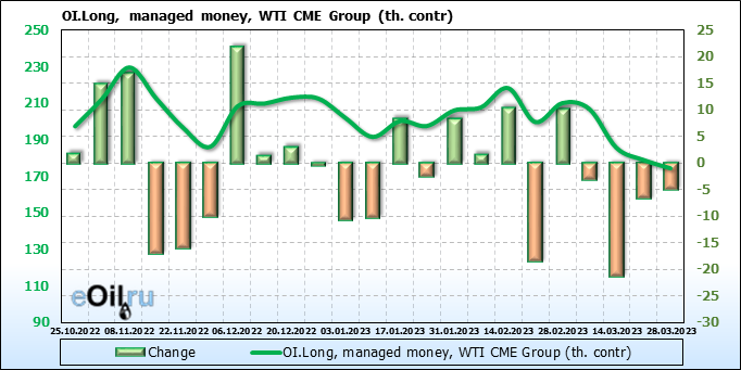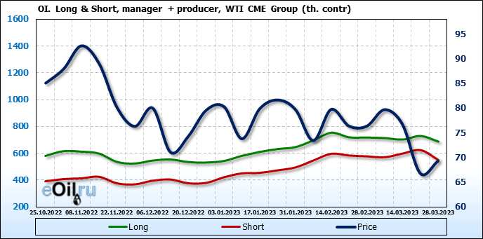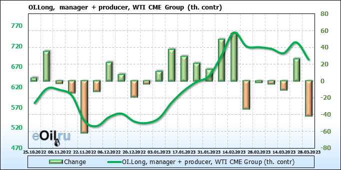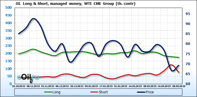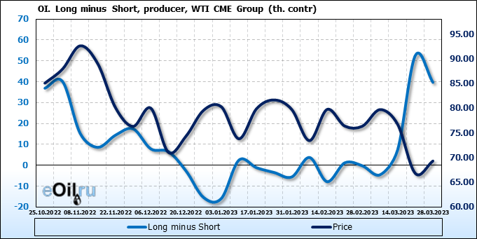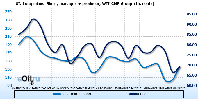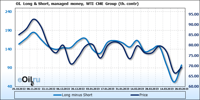 За прошлую неделю, 22.03.23 — 28.03.23, разница между длинными и короткими позициями управляющих увеличилась на 45.8 тыс. контрактов. В тоже время, цена выросла на 2.52 доллара.