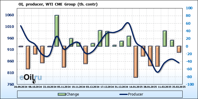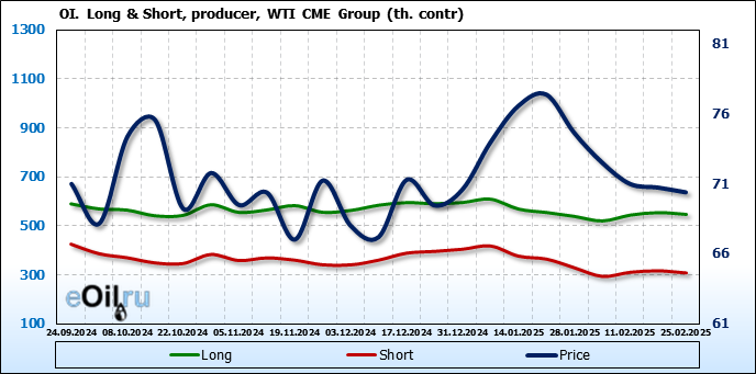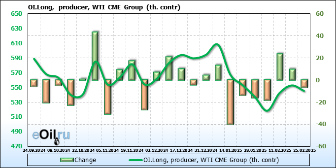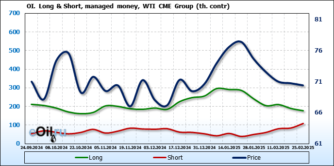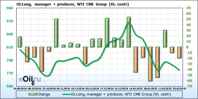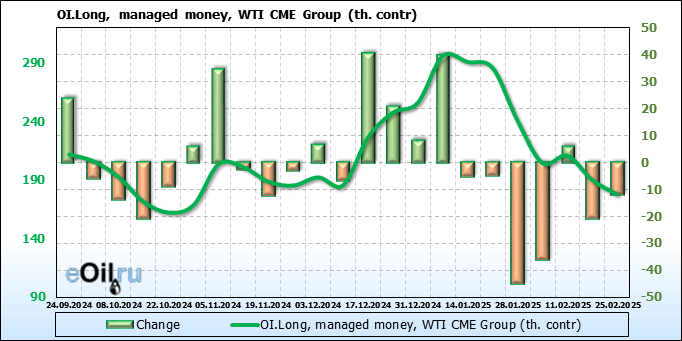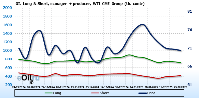 За прошлую неделю, 19.02.25 — 25.02.25, разница между длинными и короткими позициями управляющих сократилась на 37.1 тыс. контрактов. В тоже время, цена упала на 0.34 доллара.