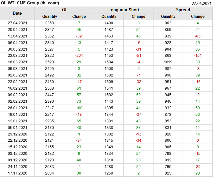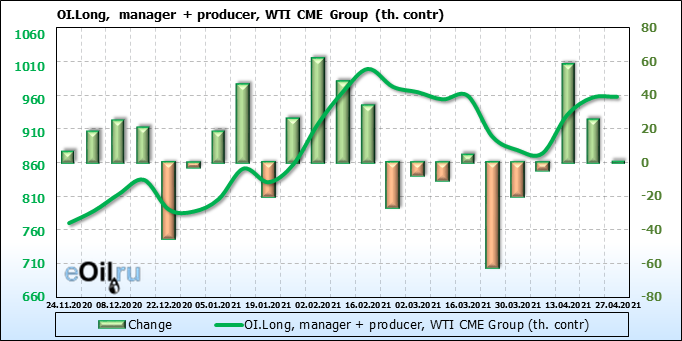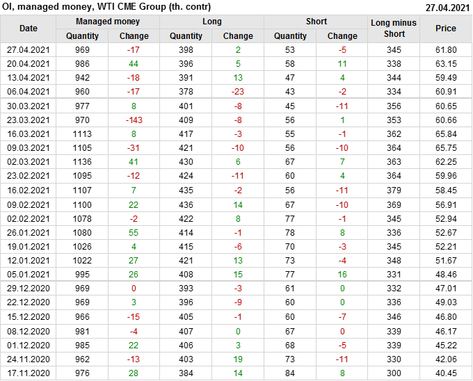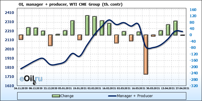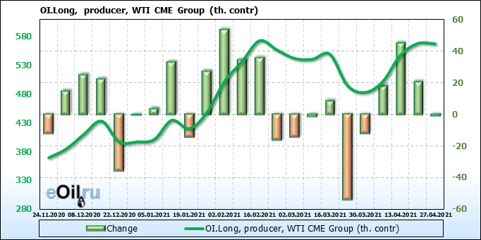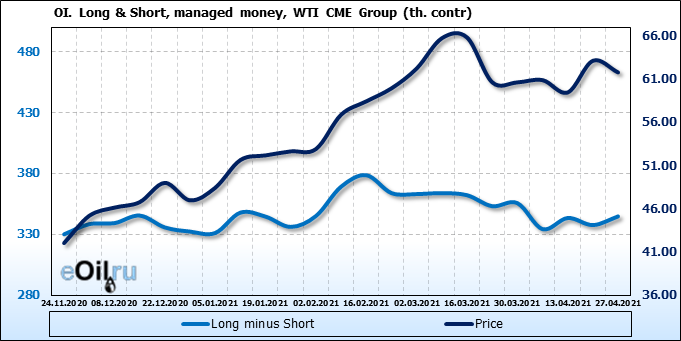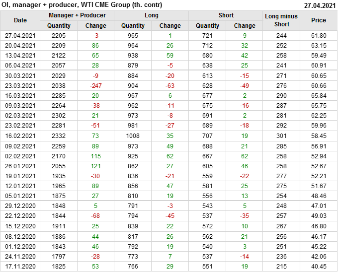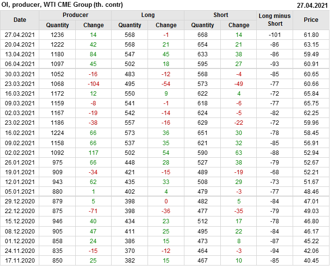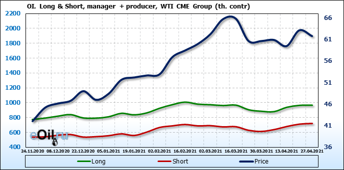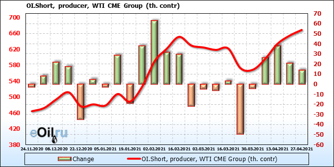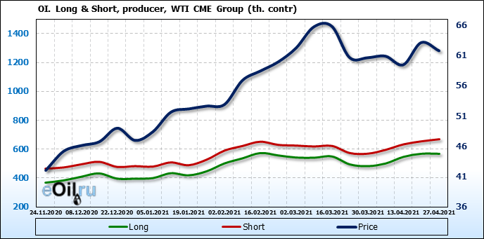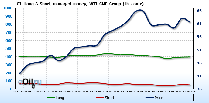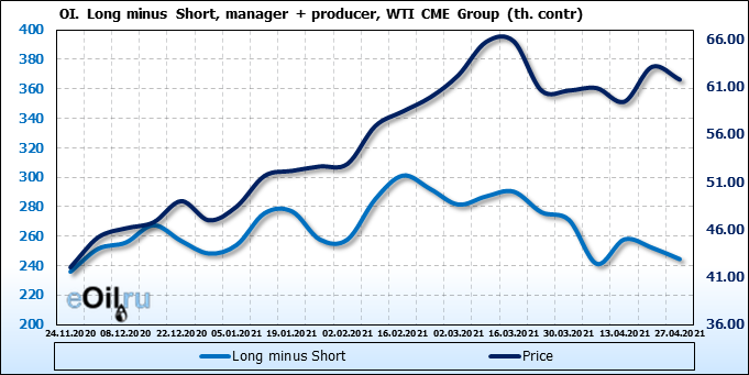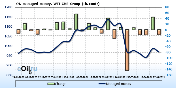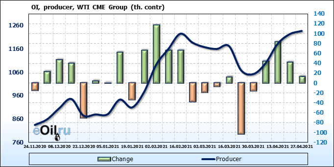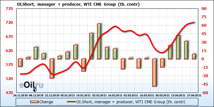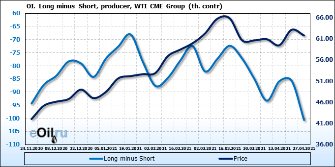 За прошлую неделю, 21.04.21 — 27.04.21, разница между длинными и короткими позициями управляющих выросла на 7.2 тыс. контрактов. В тоже время, цена упала на 1.35 доллара. Управляющие наращивают длинные позиции, что отражает их видение возможностей роста цены в ближайшее время, и это несмотря на то, что цены на отчетной неделе падали. Если давление со стороны покупателей будет продолжено, рынок развернется вверх.