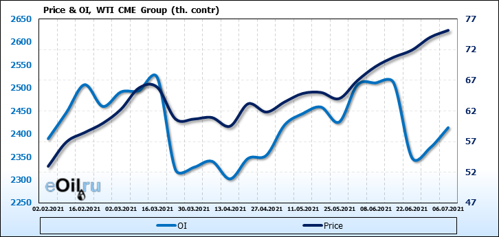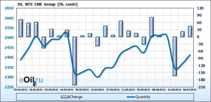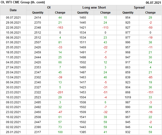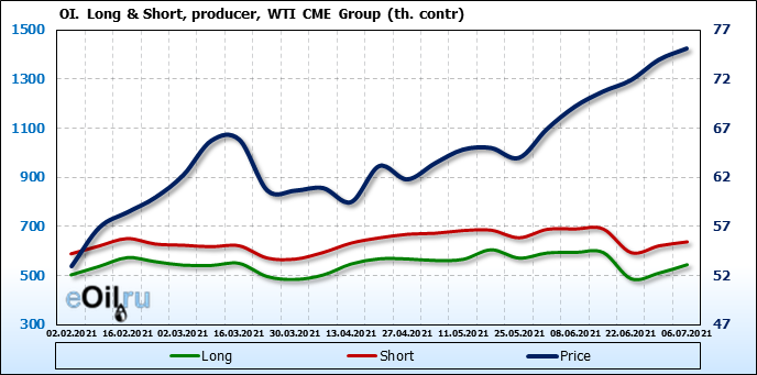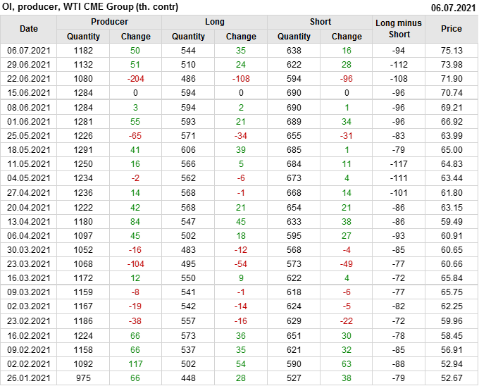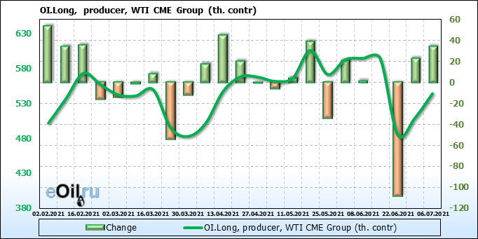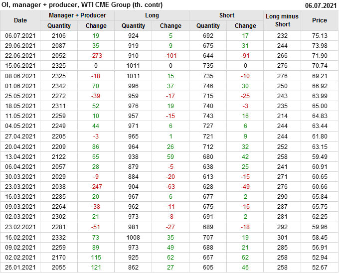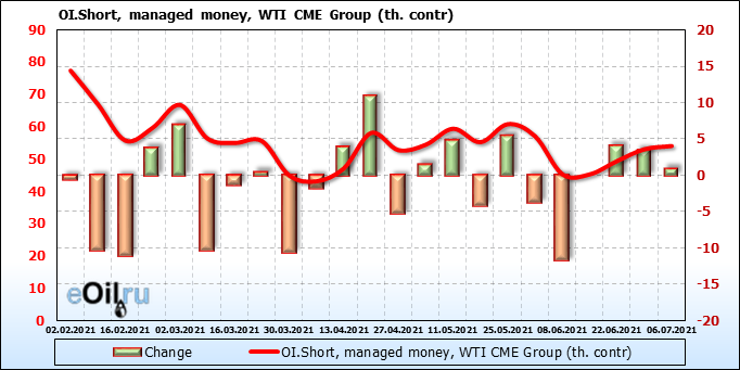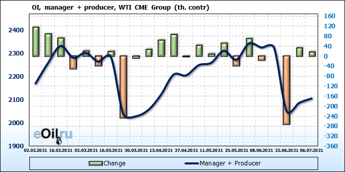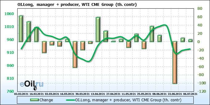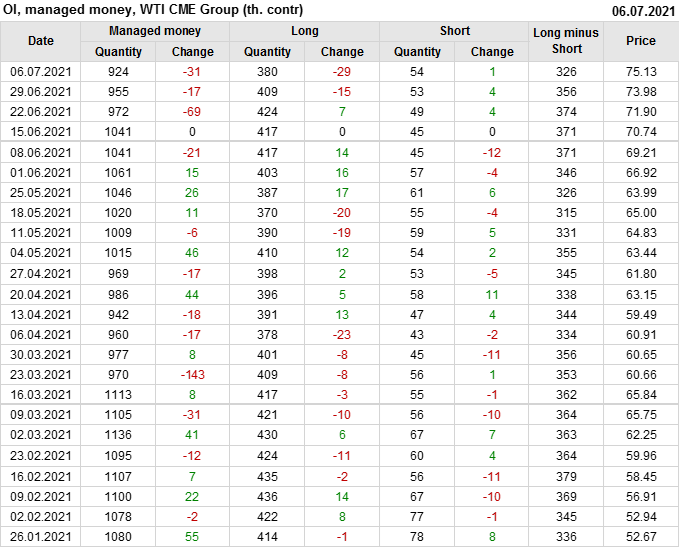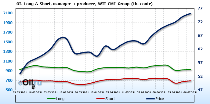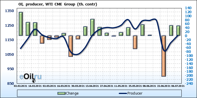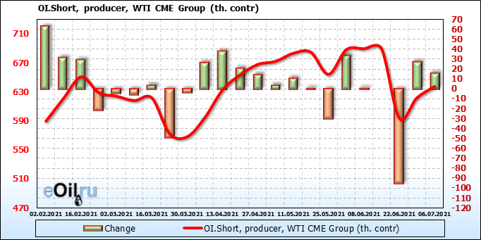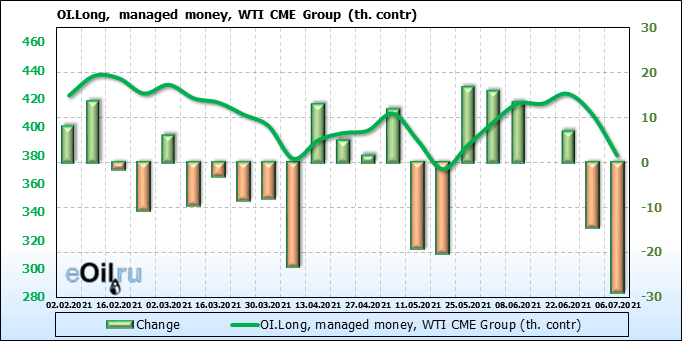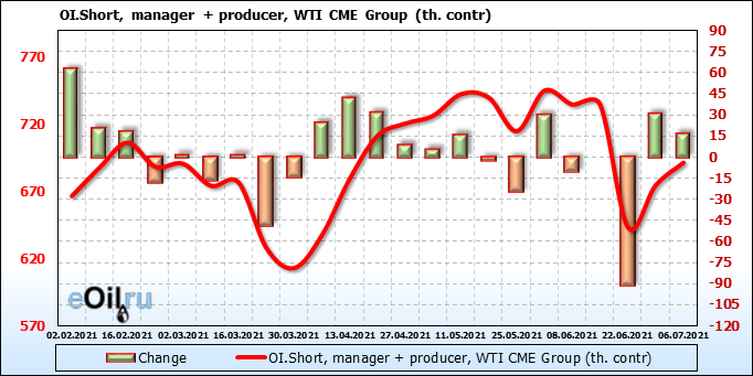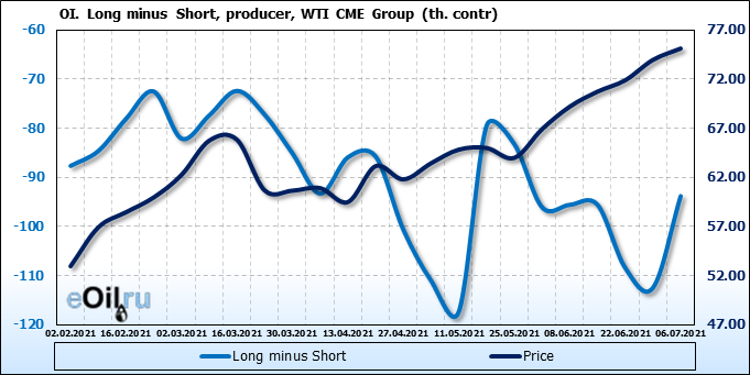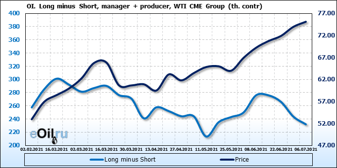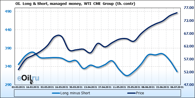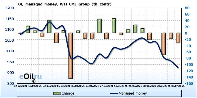 За прошлую неделю, 30.06.21 — 06.07.21, разница между длинными и короткими позициями управляющих сократилась на 30.2 тыс. контрактов. В тоже время, цена выросла на 1.15 доллара.