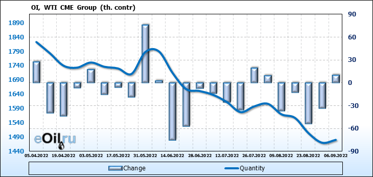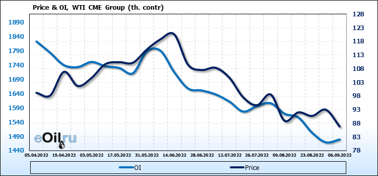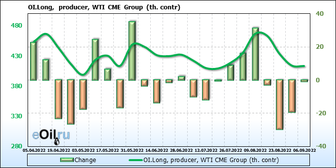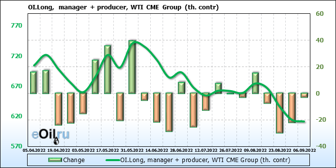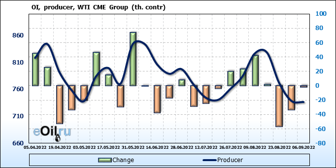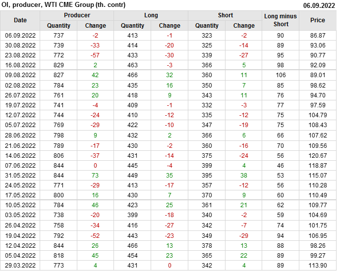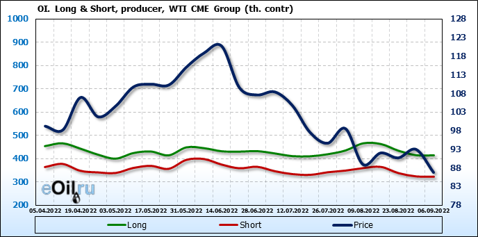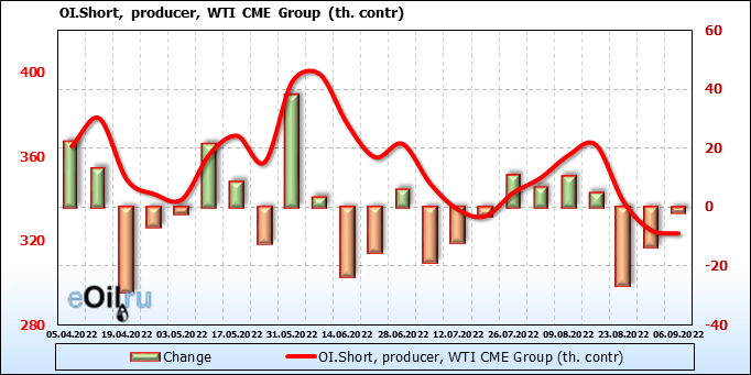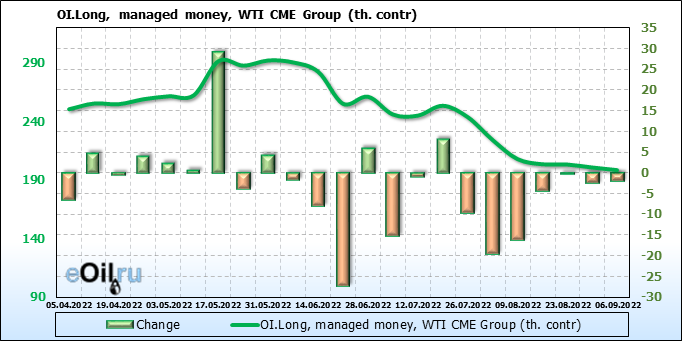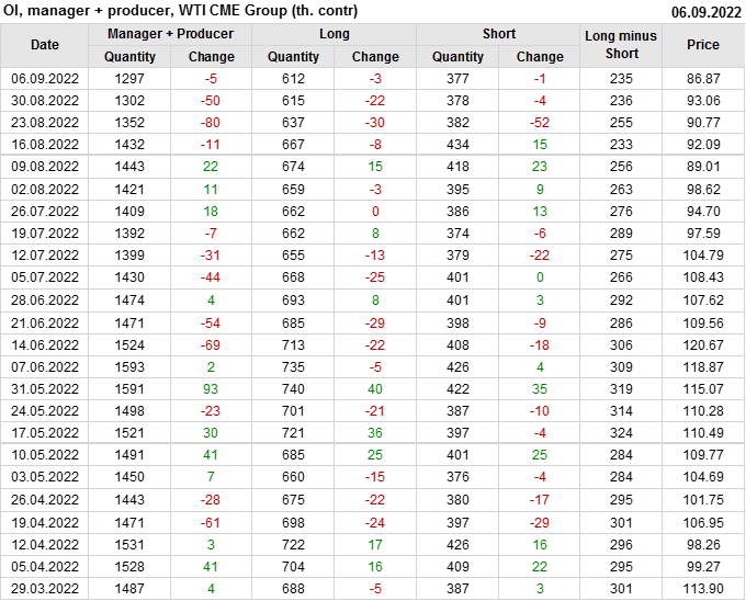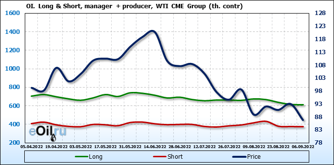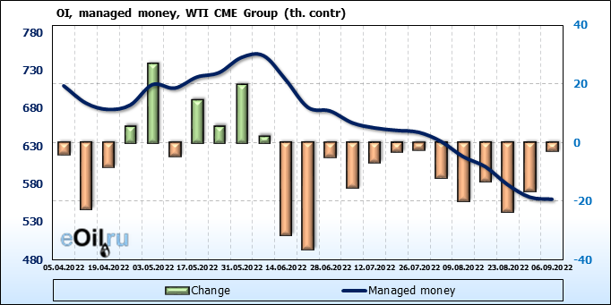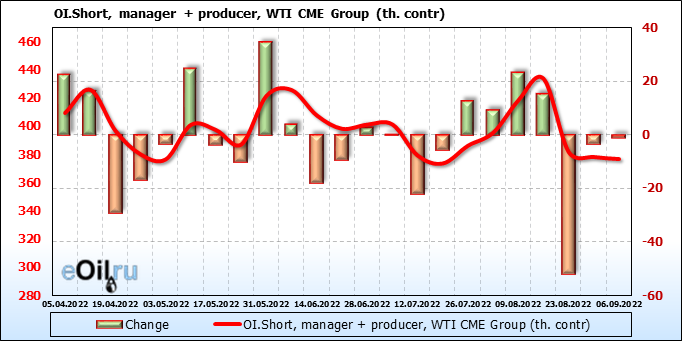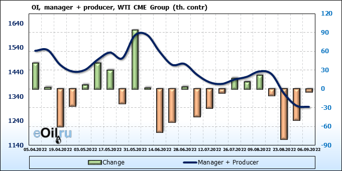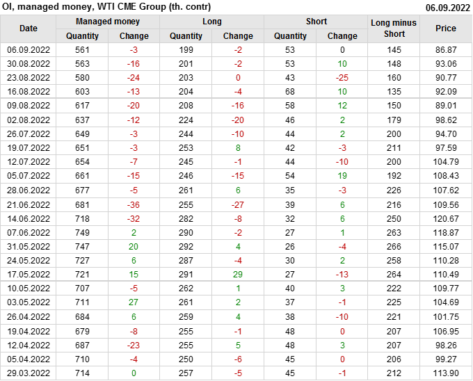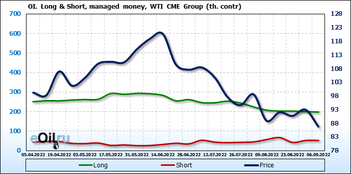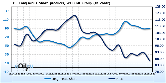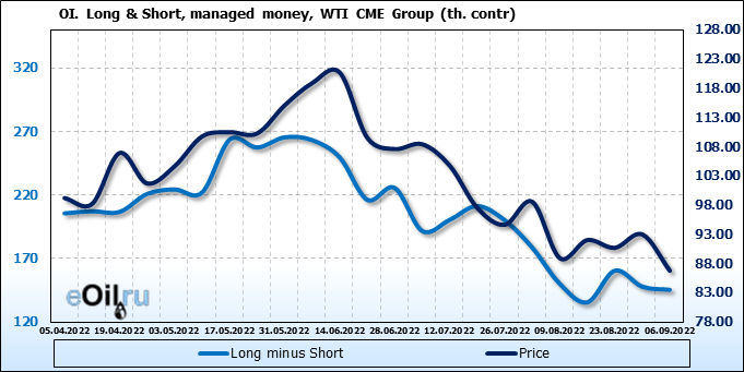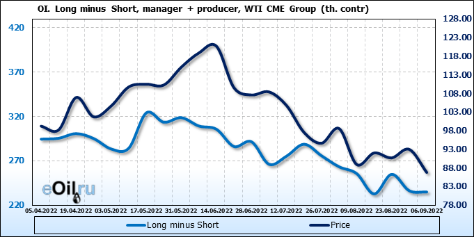 За прошлую неделю, 31.08.22 — 06.09.22, разница между длинными и короткими позициями управляющих сократилась на 2.4 тыс. контрактов. В тоже время, цена упала на 6.19 доллара.