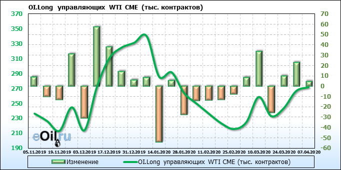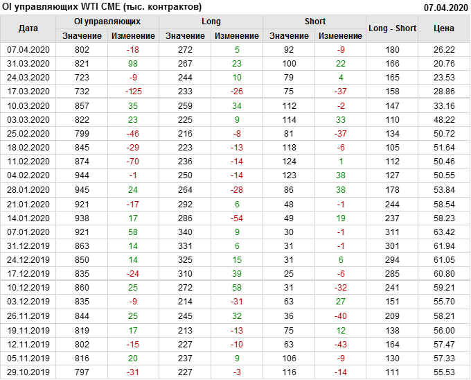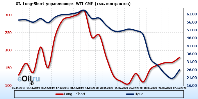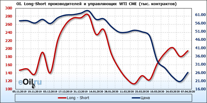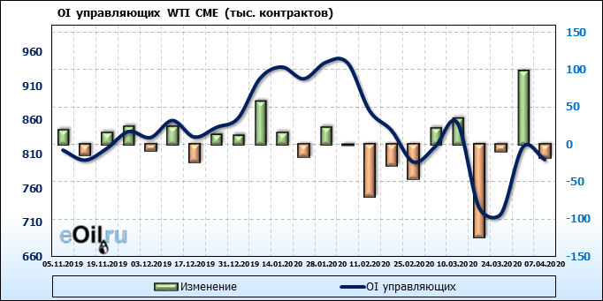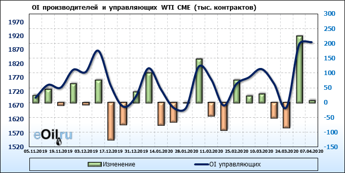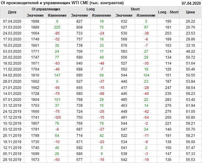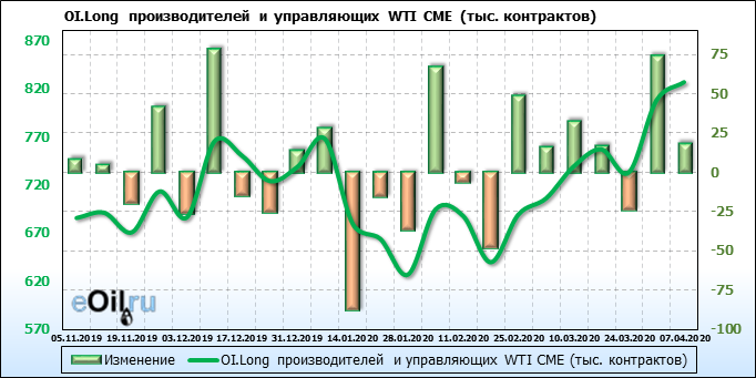 За прошлую неделю, 01.04.20 — 07.04.20, разница между длинными и короткими позициями управляющих выросла на 14 тыс. контрактов. В тоже время, цена выросла на 5.46 доллара. Управляющие наращивают позиции, разгоняя тем самым рост цен, что говорит нам о текущей силе рынка.