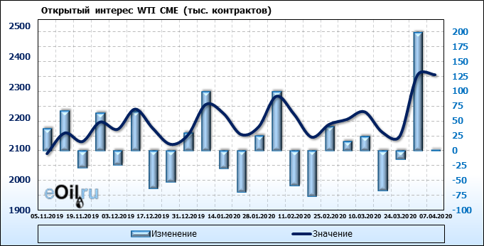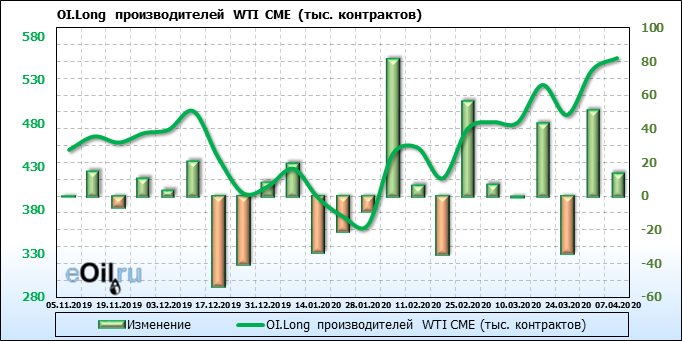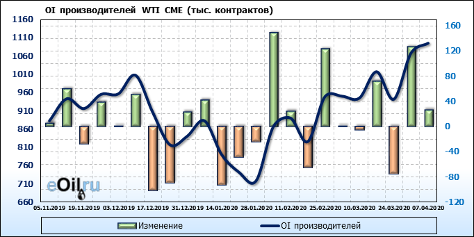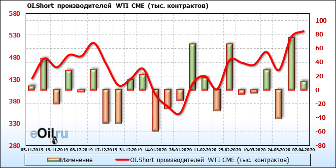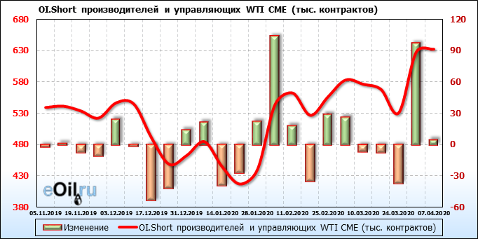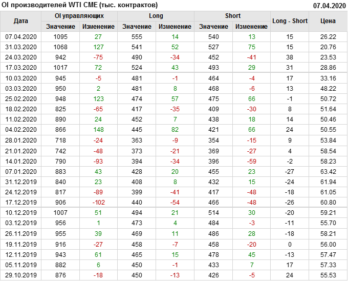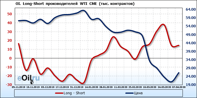 За прошлую неделю, 01.04.20 — 07.04.20, разница между длинными и короткими позициями производителей выросла на 0 тыс. контрактов. В тоже время, цена выросла на 5.46 доллара. Производители не торопятся наращивать продажи, предполагая, что возможен рост цены в ближайшее время.
