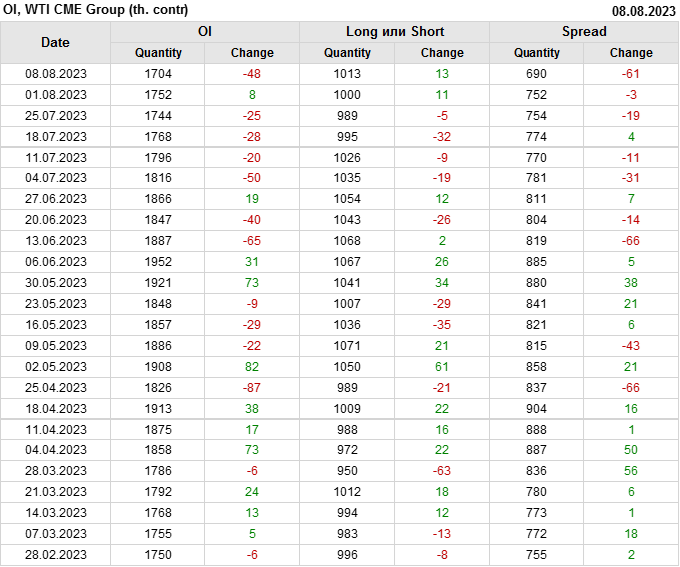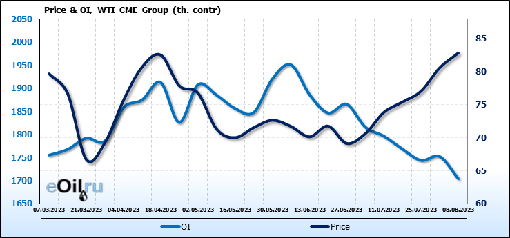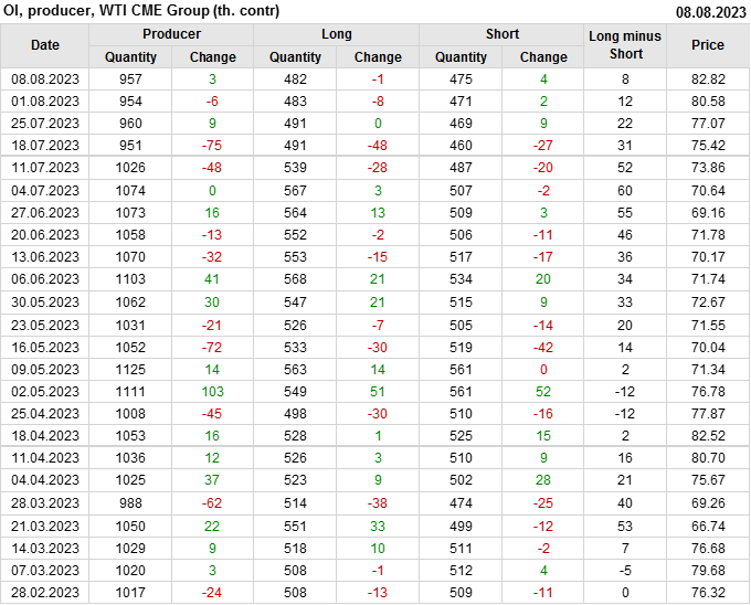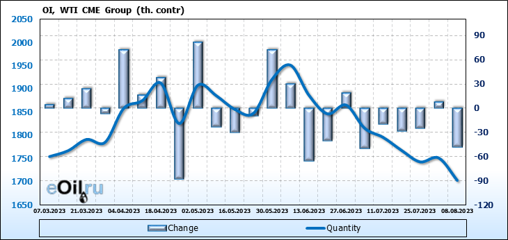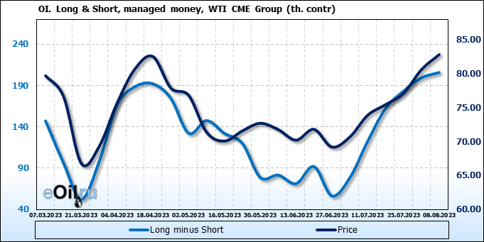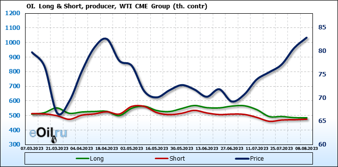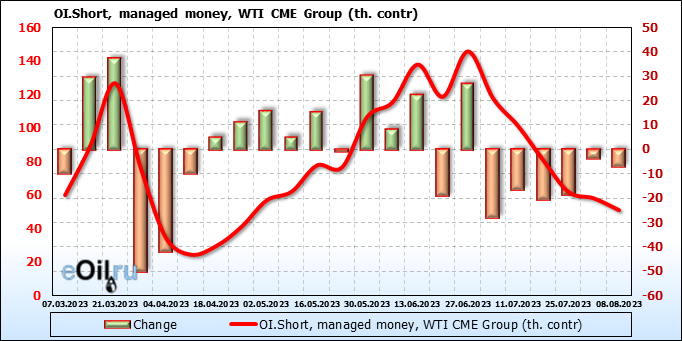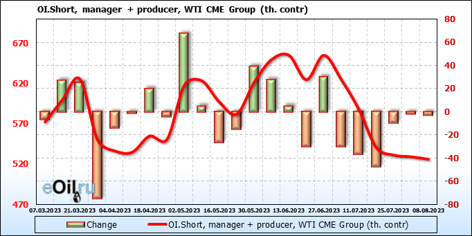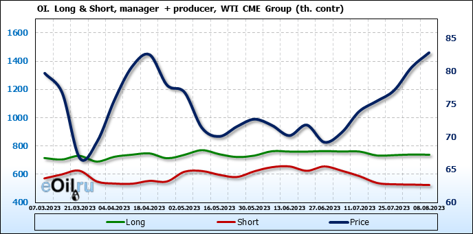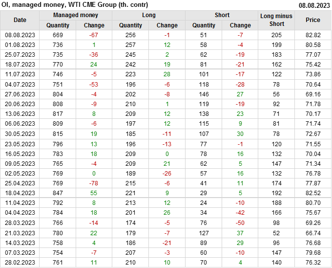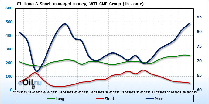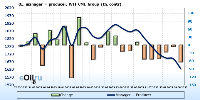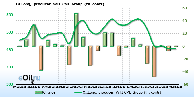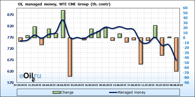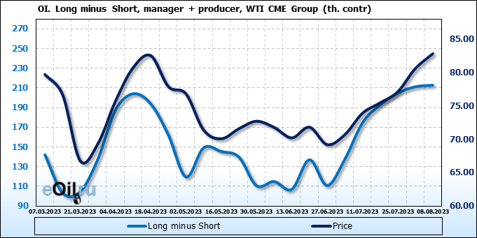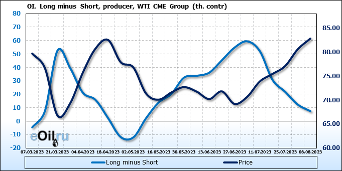 За прошлую неделю, 02.08.23 — 08.08.23, разница между длинными и короткими позициями управляющих увеличилась на 6.4 тыс. контрактов. В тоже время, цена выросла на 2.24 доллара.
