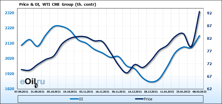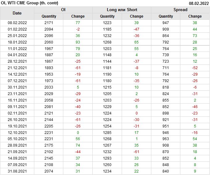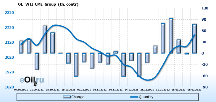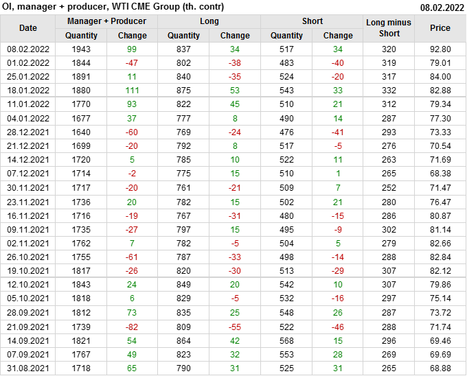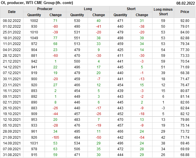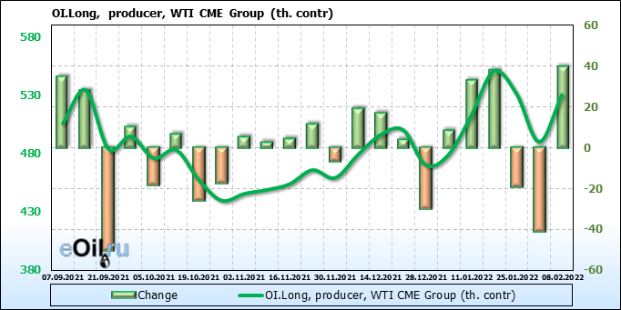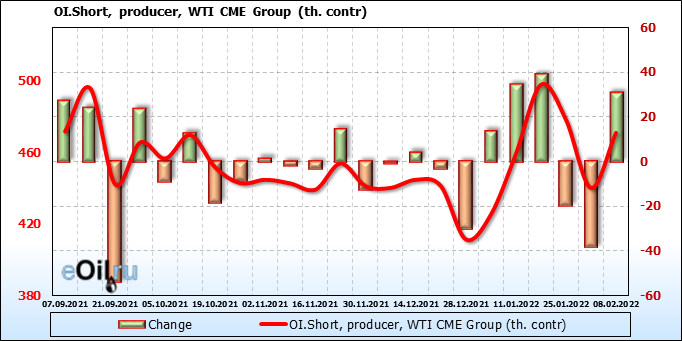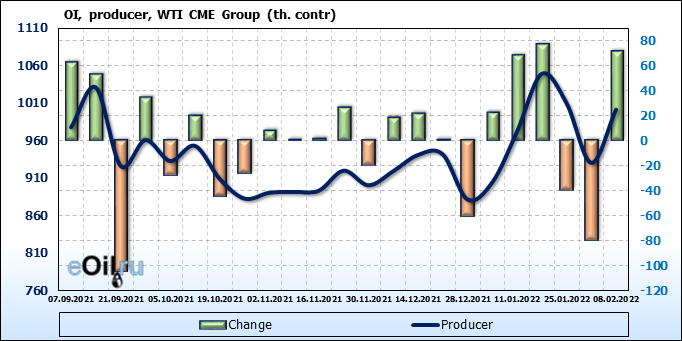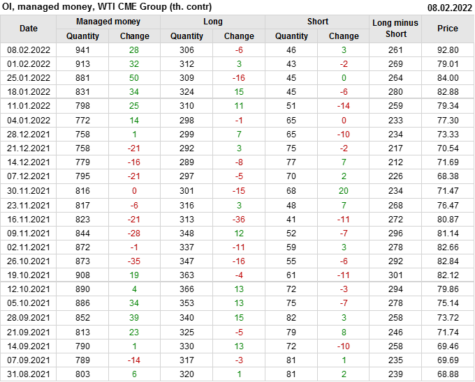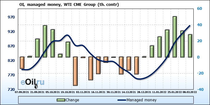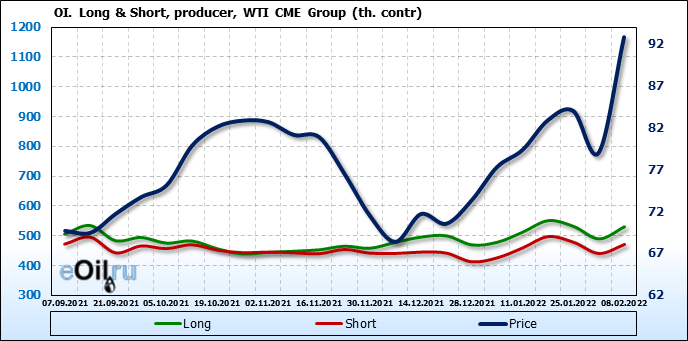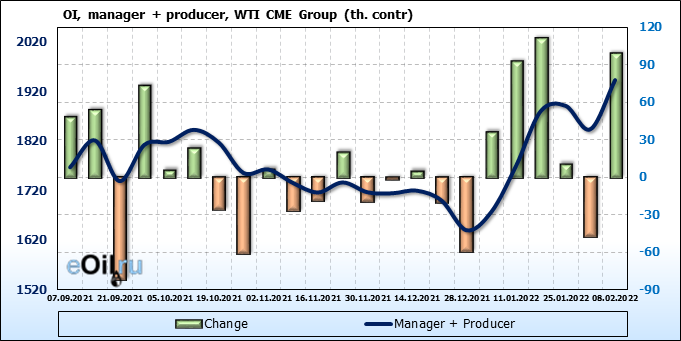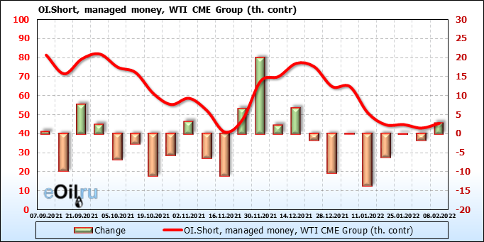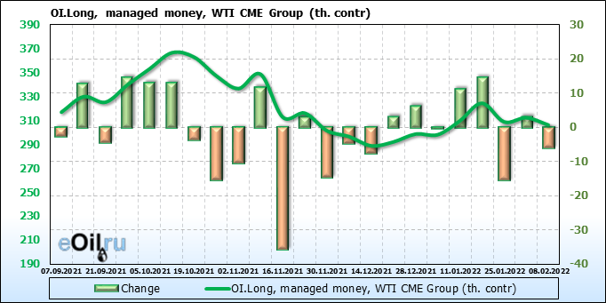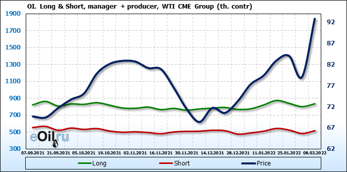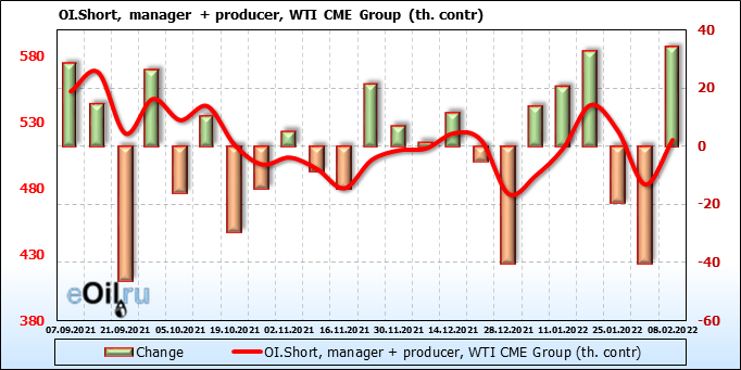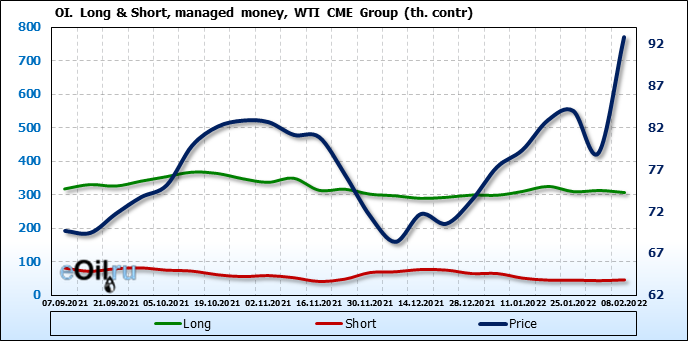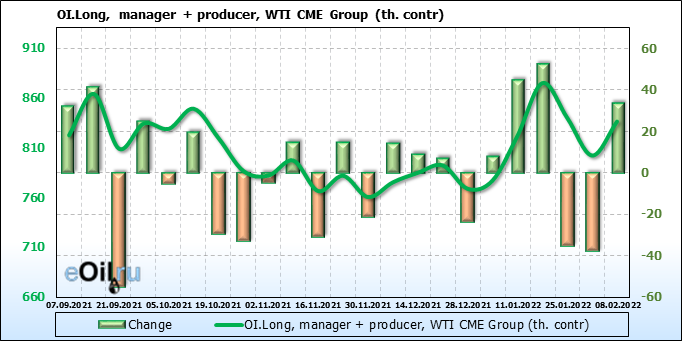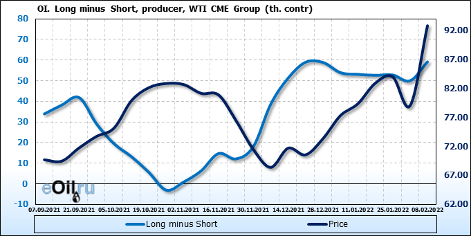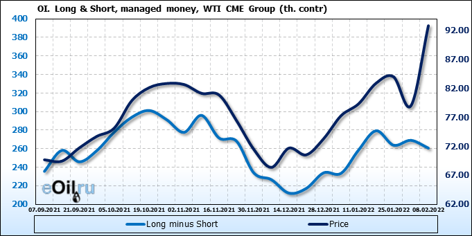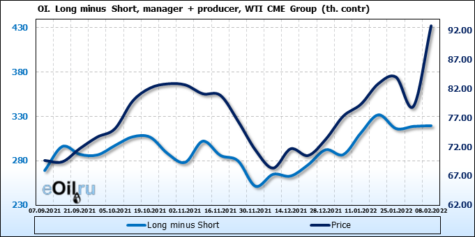 За прошлую неделю, 02.02.22 — 08.02.22, разница между длинными и короткими позициями управляющих сократилась на 8.5 тыс. контрактов. В тоже время, цена выросла на 13.79 доллара.