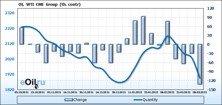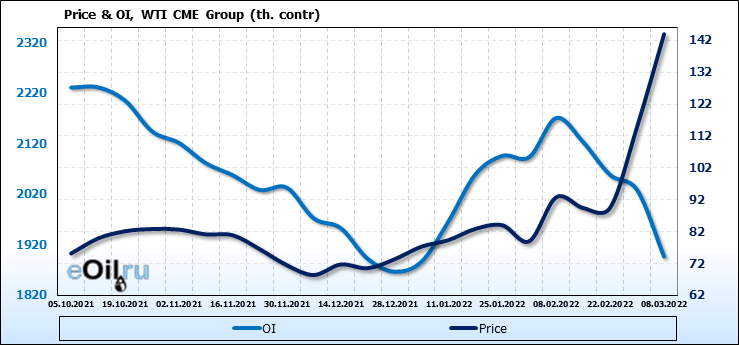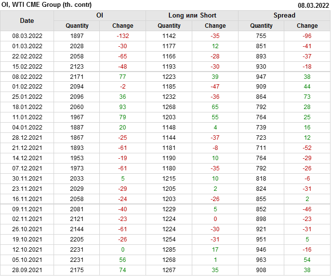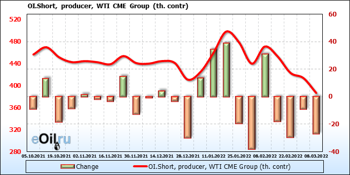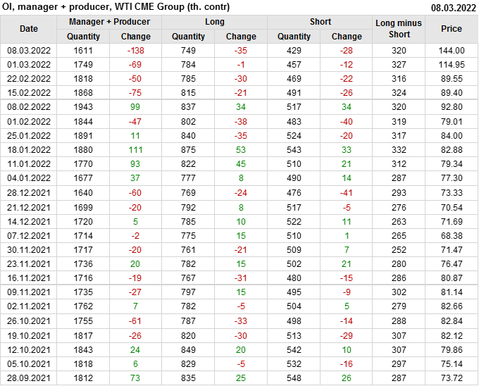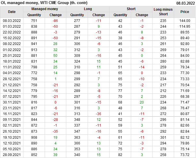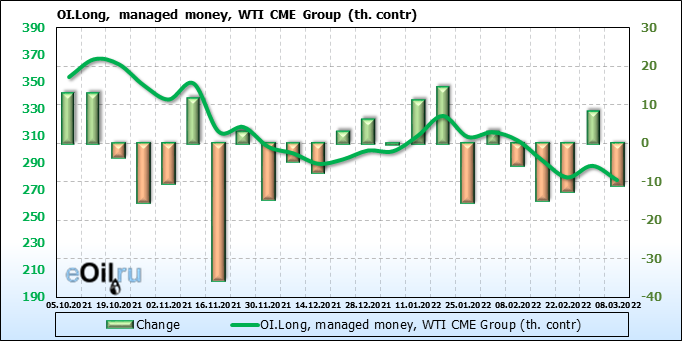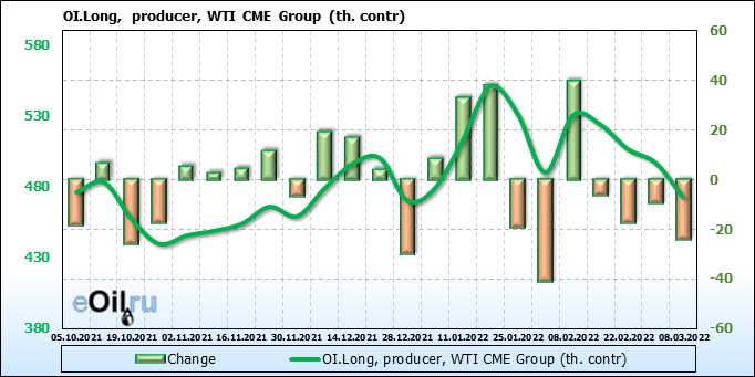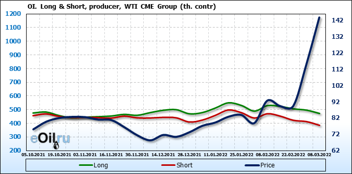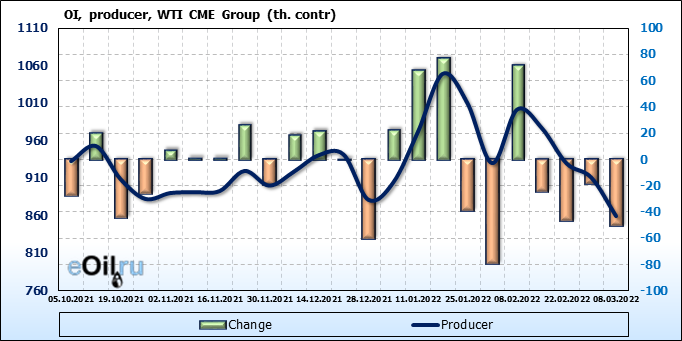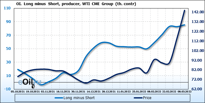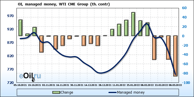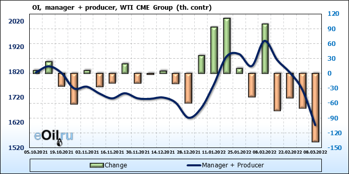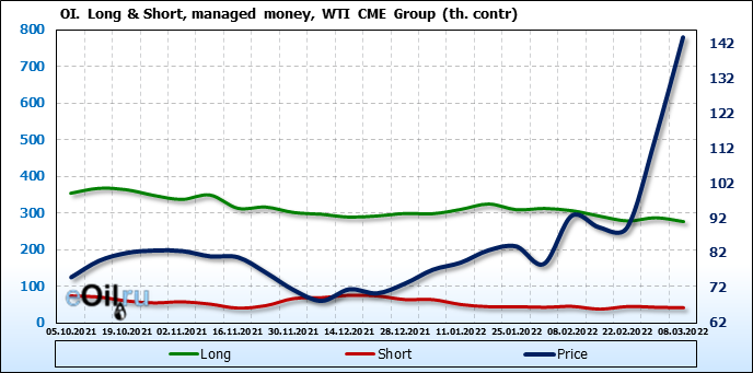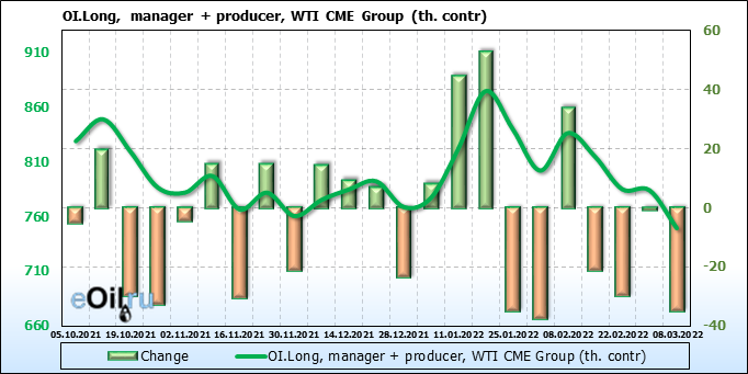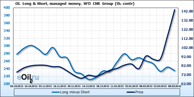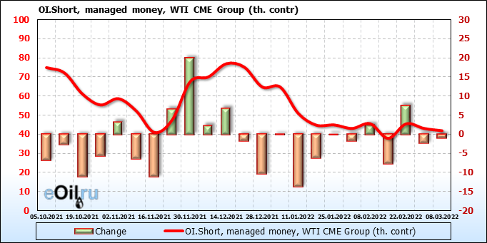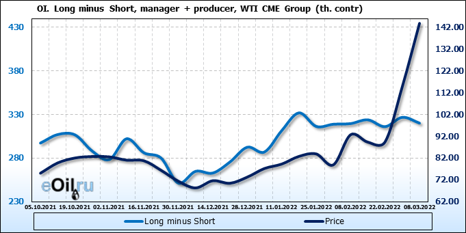 За прошлую неделю, 02.03.22 — 08.03.22, разница между длинными и короткими позициями управляющих сократилась на 9.4 тыс. контрактов. В тоже время, цена выросла на 29.05 доллара.