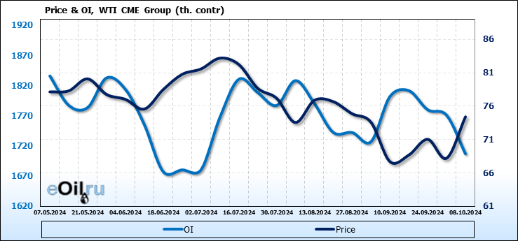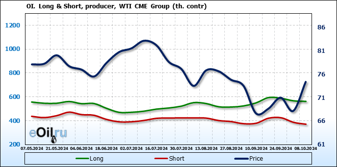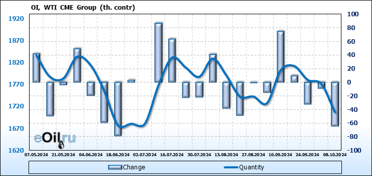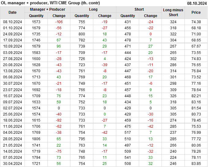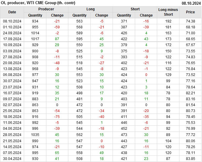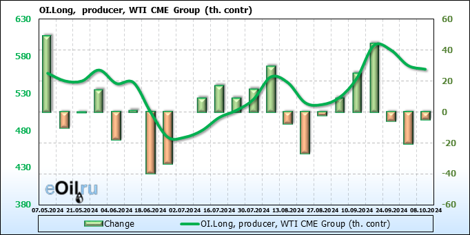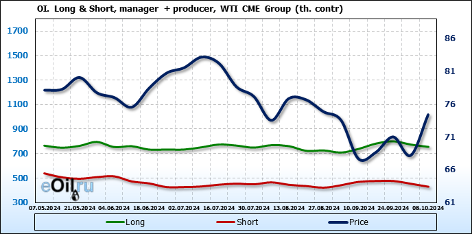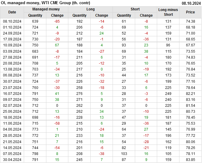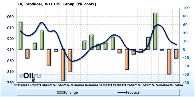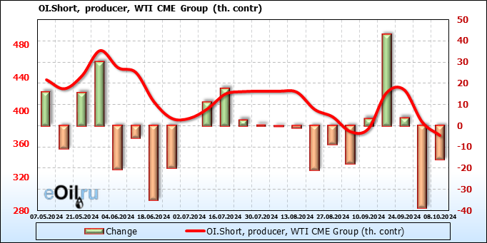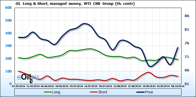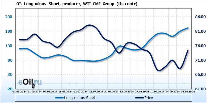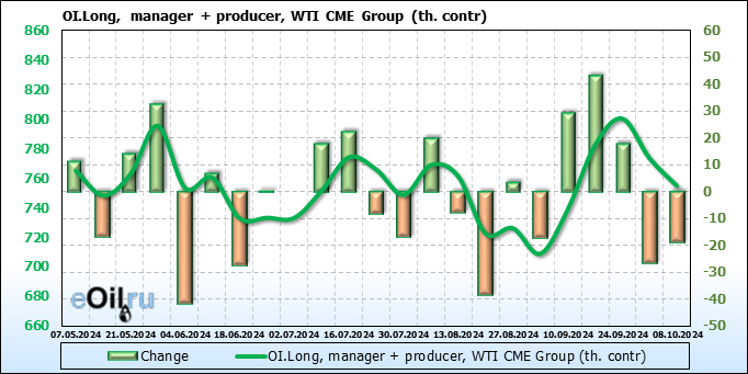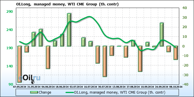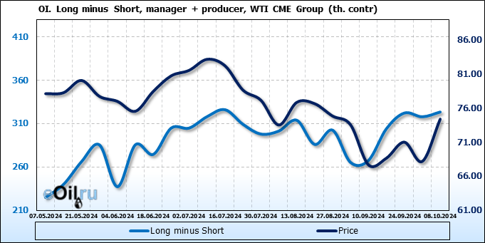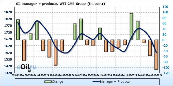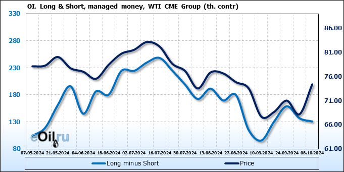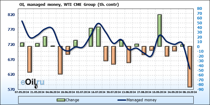 За прошлую неделю, 02.10.24 — 08.10.24, разница между длинными и короткими позициями управляющих сократилась на 5.9 тыс. контрактов. В тоже время, цена выросла на 6.2 доллара.
