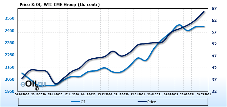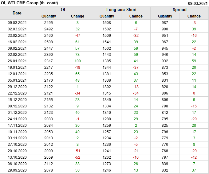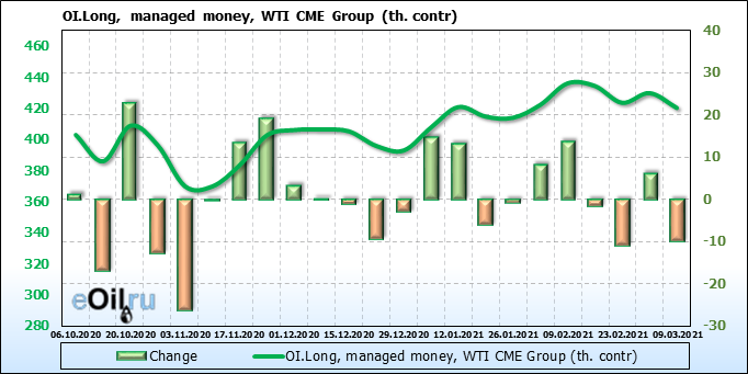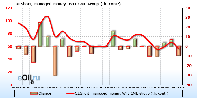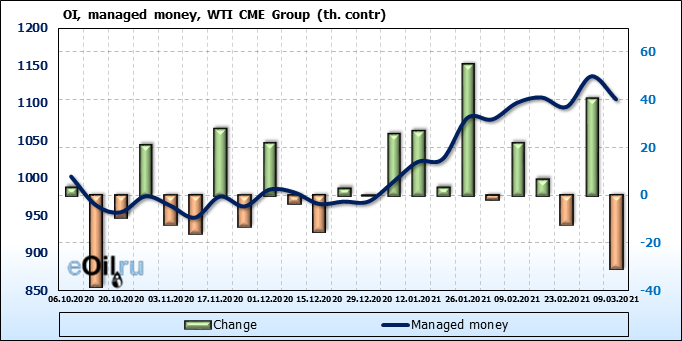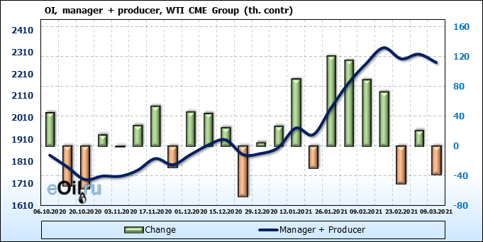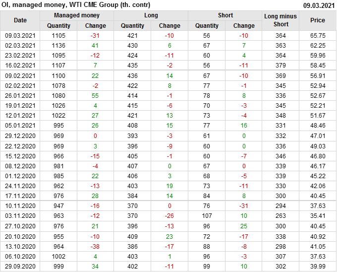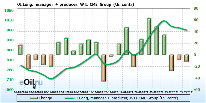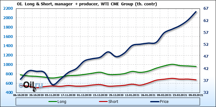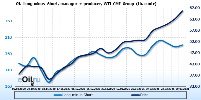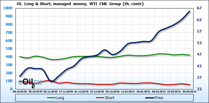 За прошлую неделю, 03.03.21 — 09.03.21, разница между длинными и короткими позициями управляющих выросла на 1 тыс. контрактов. В тоже время, цена выросла на 3.5 доллара. Управляющие наращивают позиции, разгоняя тем самым рост цен, что говорит нам о текущей силе рынка.