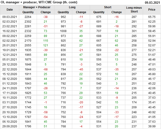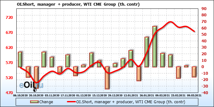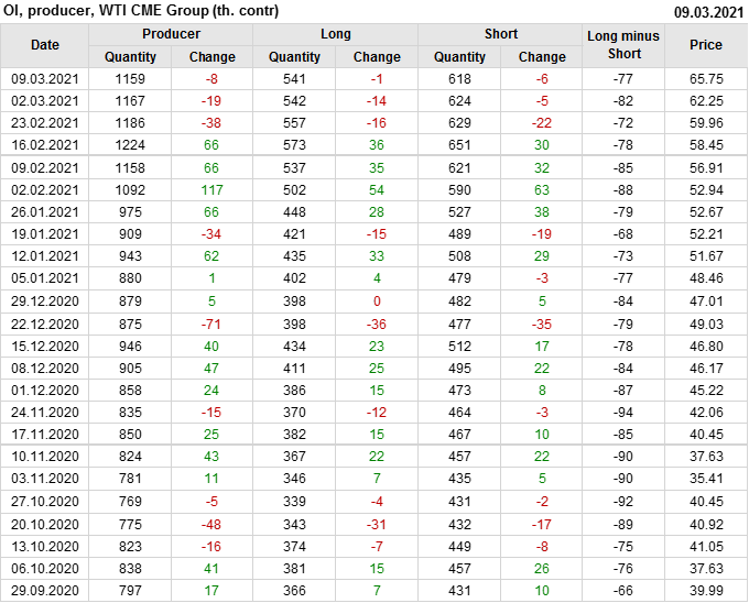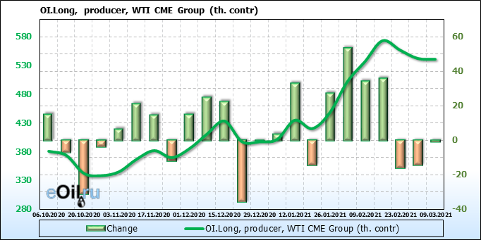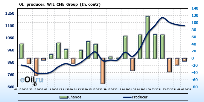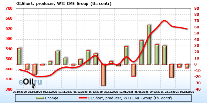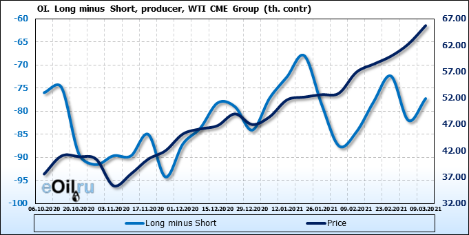 За прошлую неделю, 03.03.21 — 09.03.21, разница между длинными и короткими позициями производителей выросла на 5 тыс. контрактов. В тоже время, цена выросла на 3.5 доллара. Производители не торопятся наращивать продажи, предполагая, что возможен рост цены в ближайшее время.