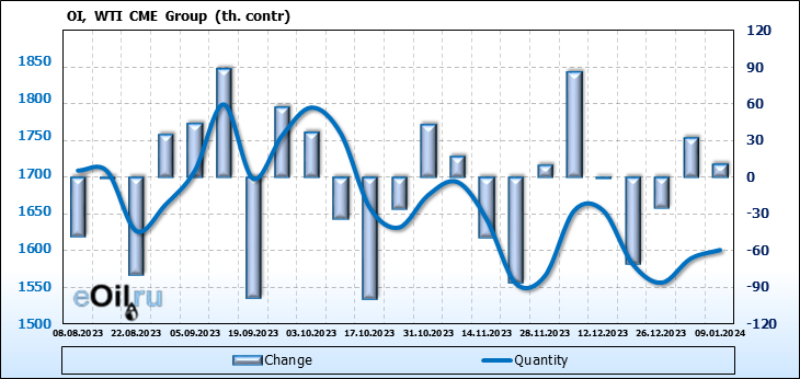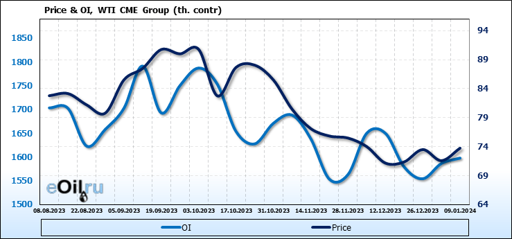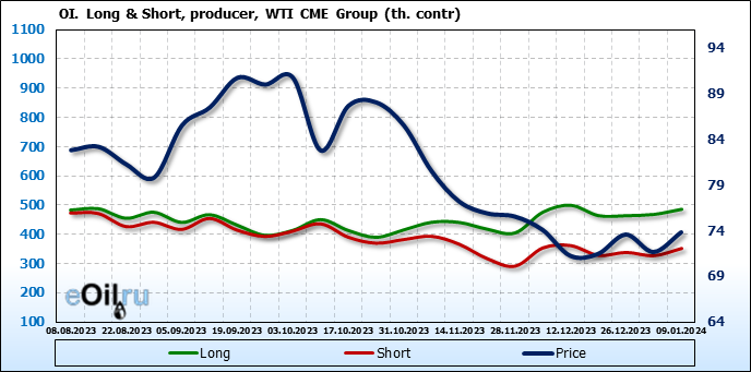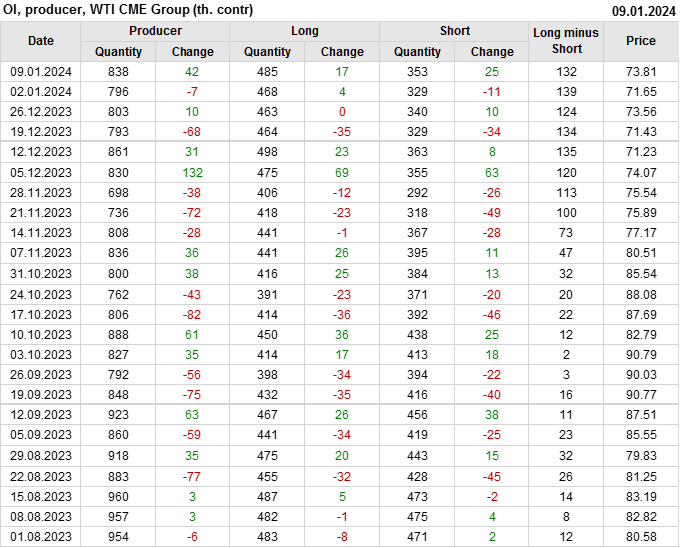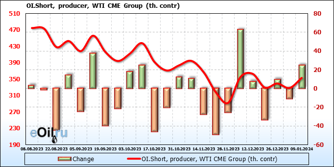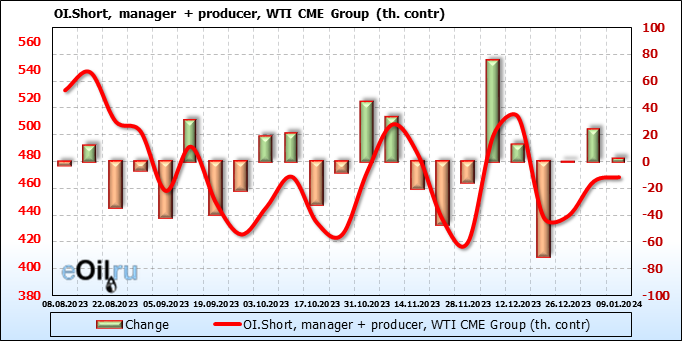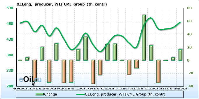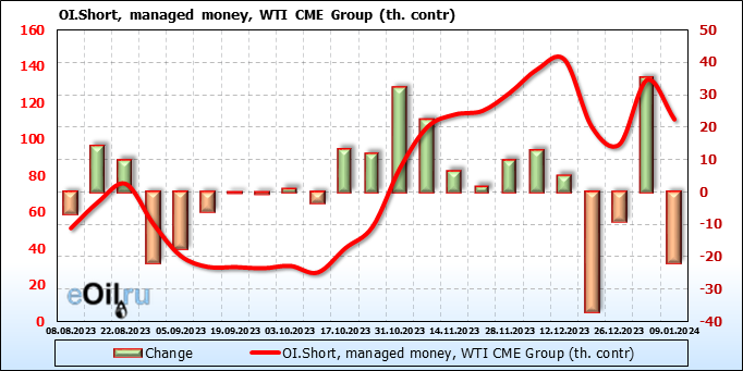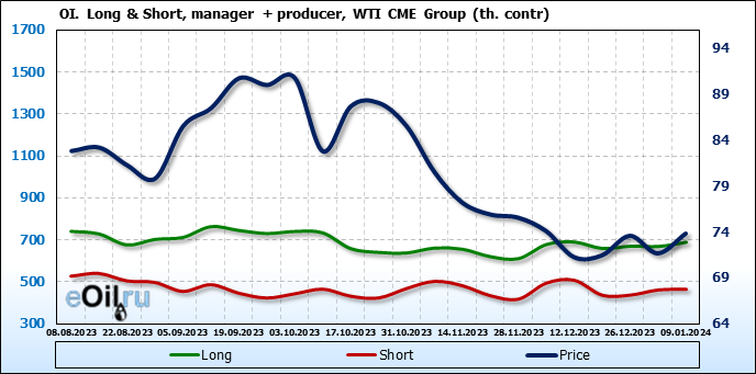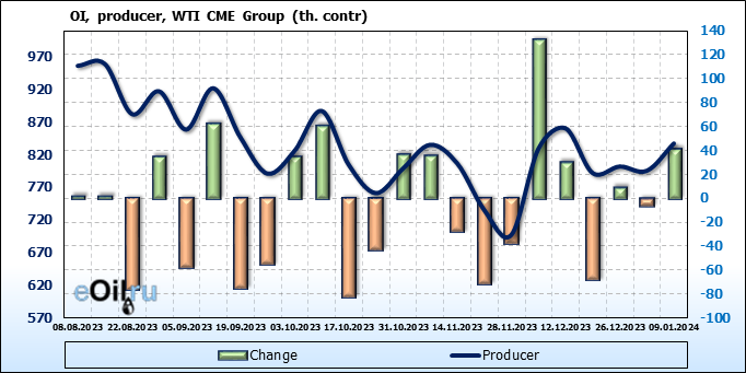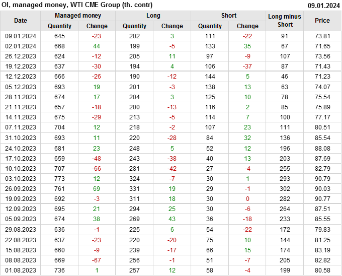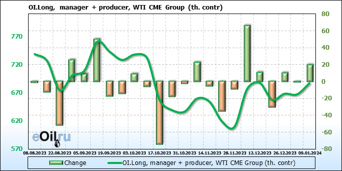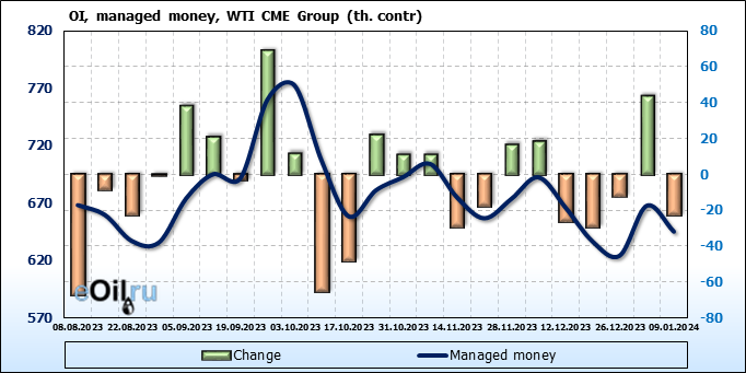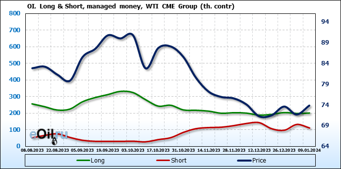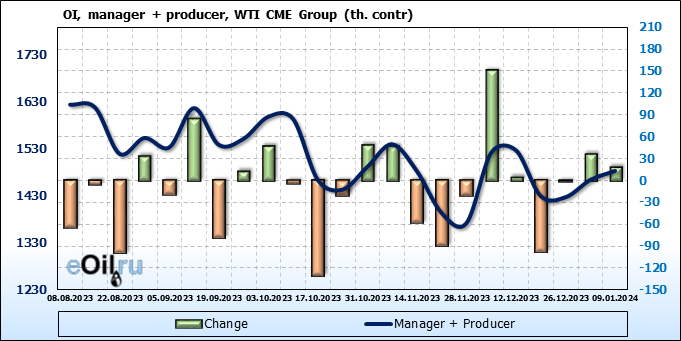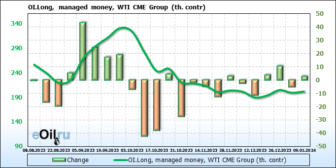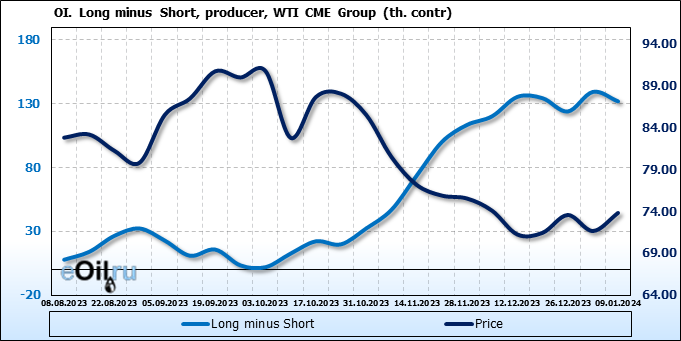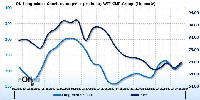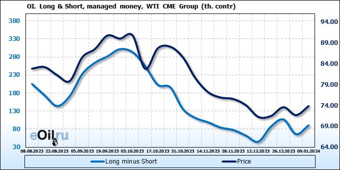 За прошлую неделю, 03.01.24 — 09.01.24, разница между длинными и короткими позициями управляющих увеличилась на 24.4 тыс. контрактов. В тоже время, цена выросла на 2.16 доллара.