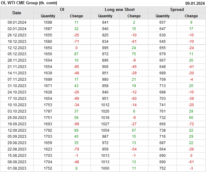 За прошлую неделю, 03.01.24 — 09.01.24, открытый интерес вырос на 11 тыс. контрактов. Объем вовлеченных в торговлю контрактов составляет 1 598 167 штук. Текущее положение дел на рынке таково, что деньги в течение прошлой недели приходили на рынок поддерживая тенденцию.