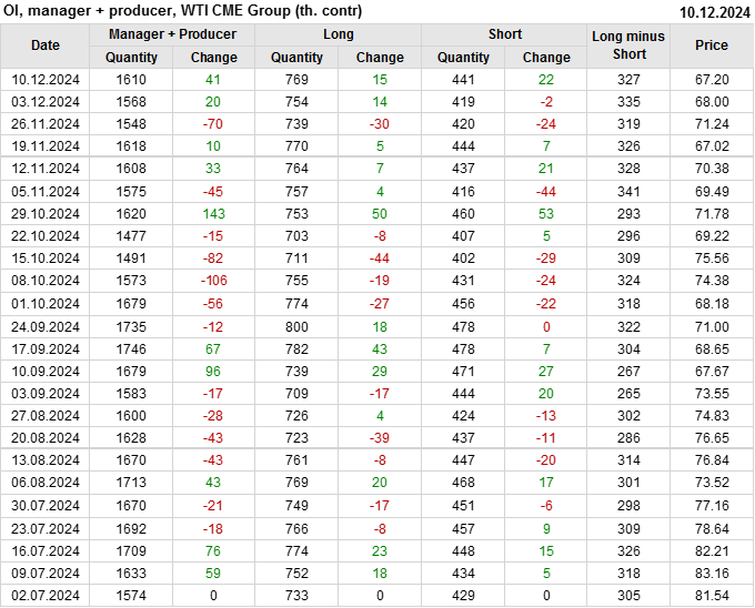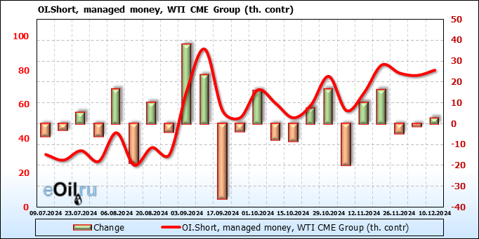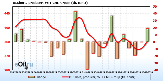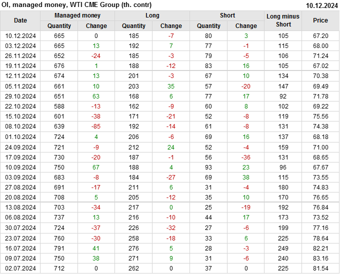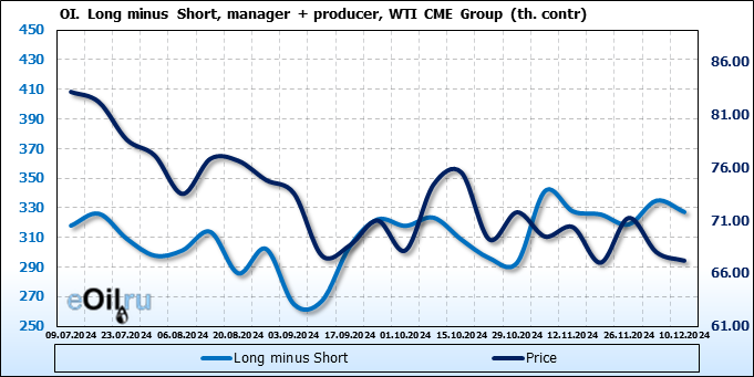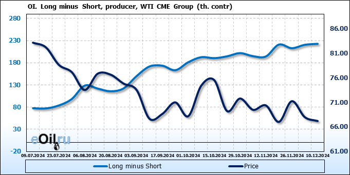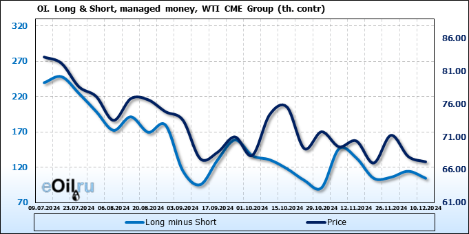 За прошлую неделю, 04.12.24 — 10.12.24, разница между длинными и короткими позициями управляющих сократилась на 9.9 тыс. контрактов. В тоже время, цена упала на 0.8 доллара.
