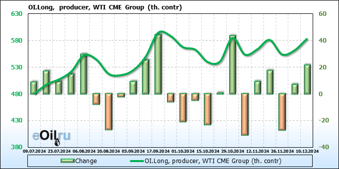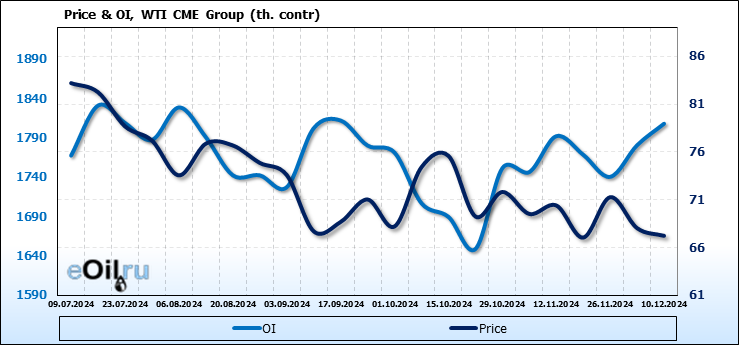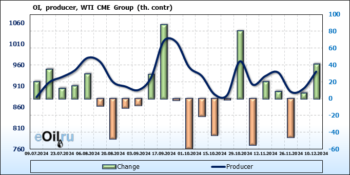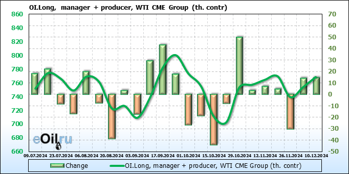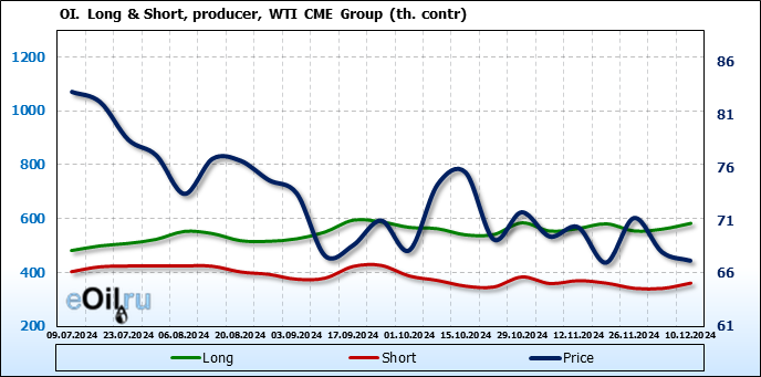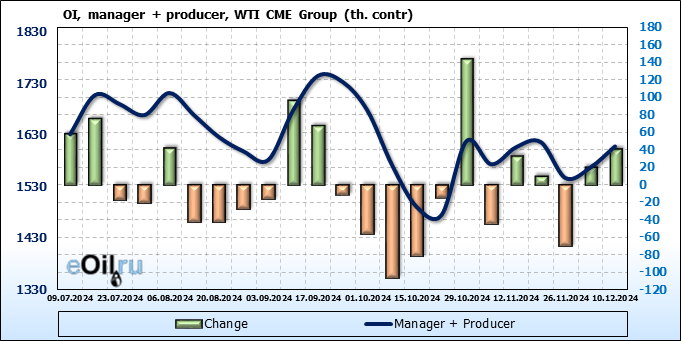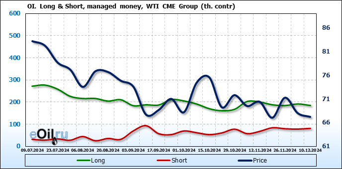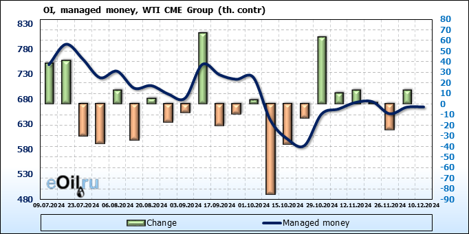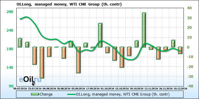 За прошлую неделю, 04.12.24 — 10.12.24, разница между длинными и короткими позициями управляющих сократилась на 9.9 тыс. контрактов. В тоже время, цена упала на 0.8 доллара.