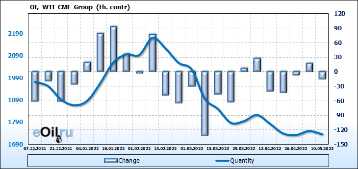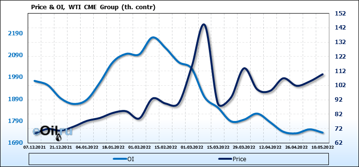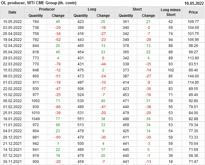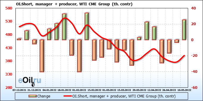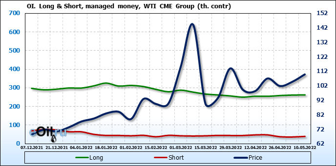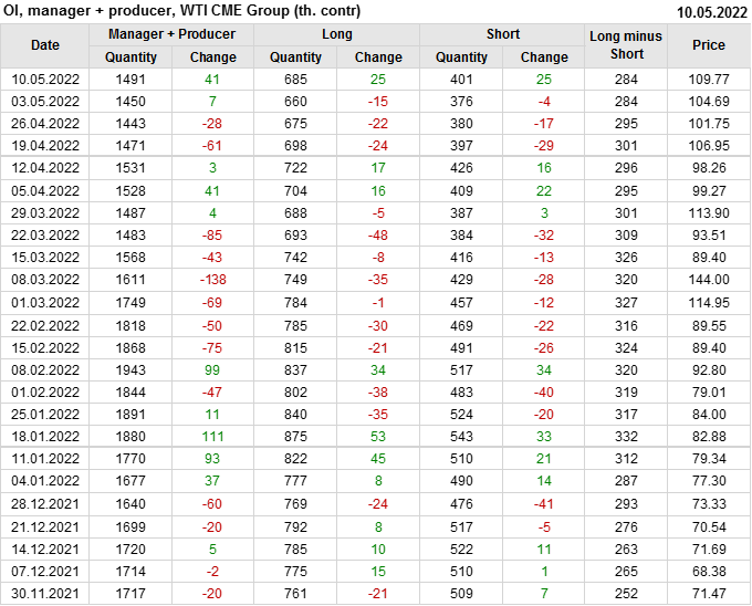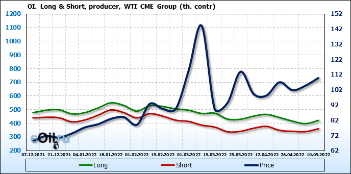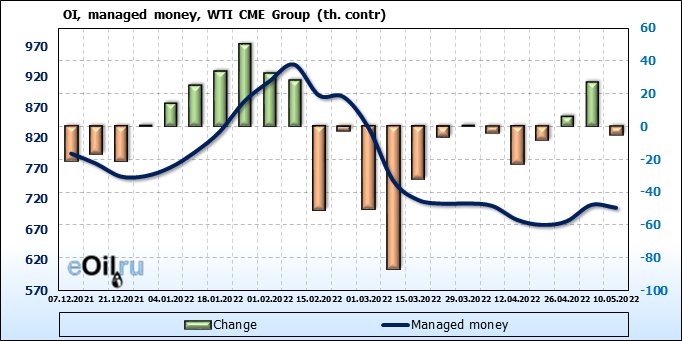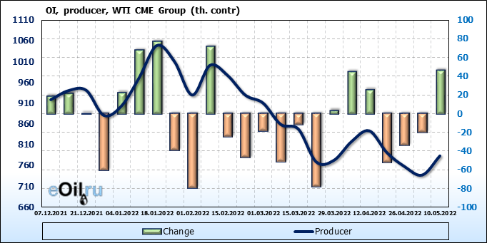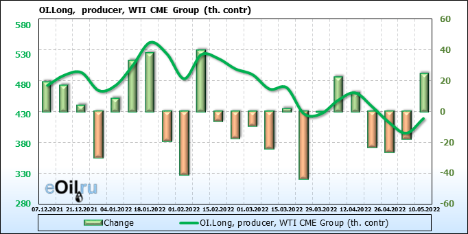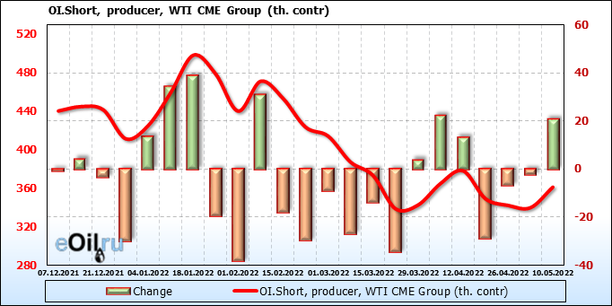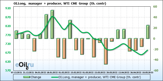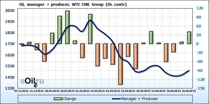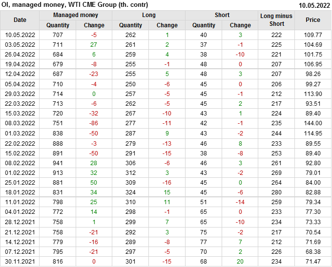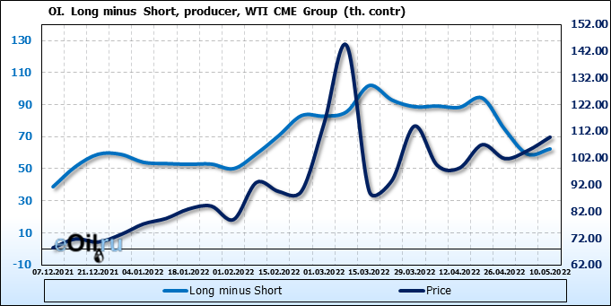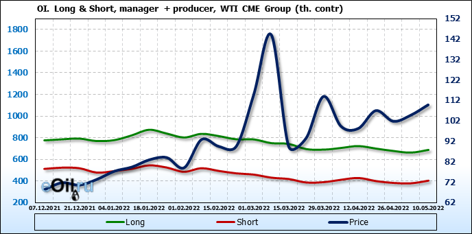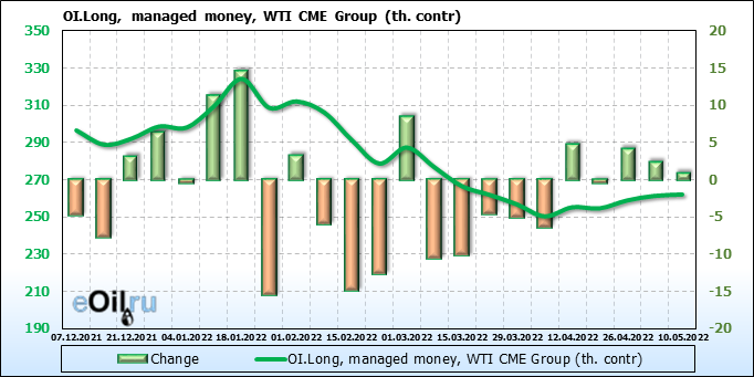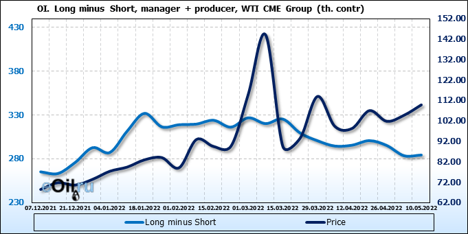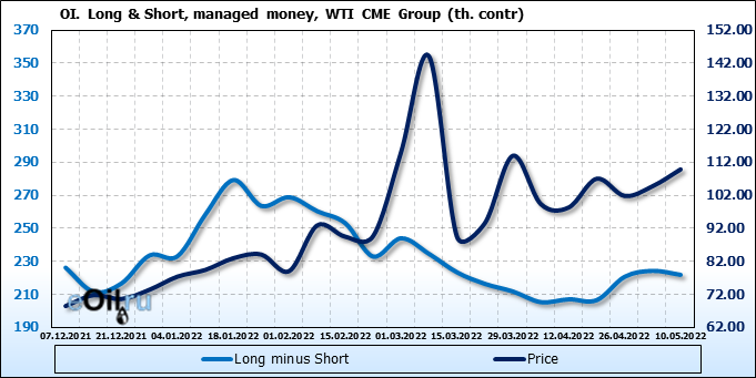 За прошлую неделю, 04.05.22 — 10.05.22, разница между длинными и короткими позициями управляющих сократилась на 2.4 тыс. контрактов. В тоже время, цена выросла на 5.08 доллара.