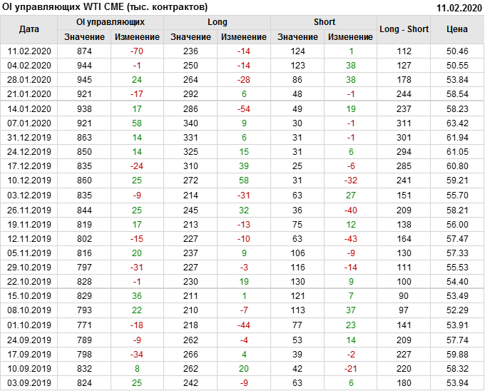 За прошлую неделю, 05.02.20 — 11.02.20, разница между длинными и короткими позициями управляющих упала на 14 тыс. контрактов. В тоже время, цена упала на 0.09 доллара. Наращивание коротких позиций спекулянтами приводит к падению цен. Если давление со стороны медведей продолжится, то мы можем увидеть новые минимумы.