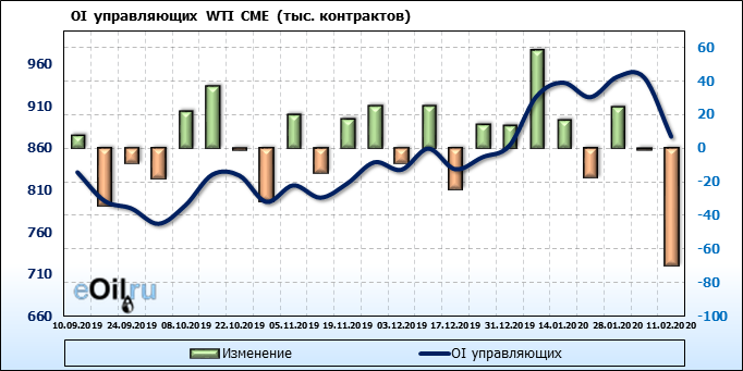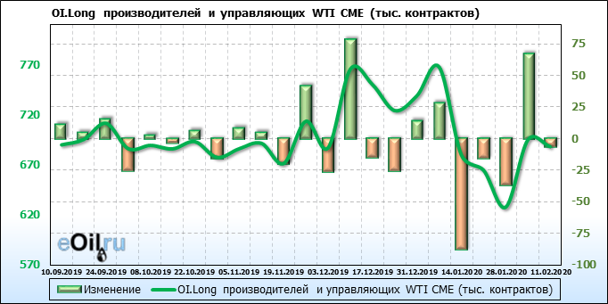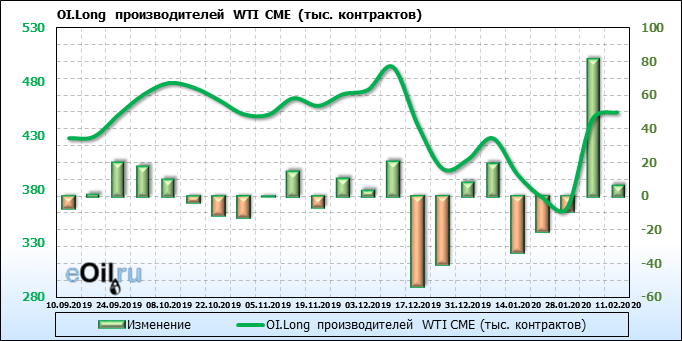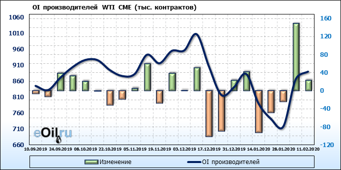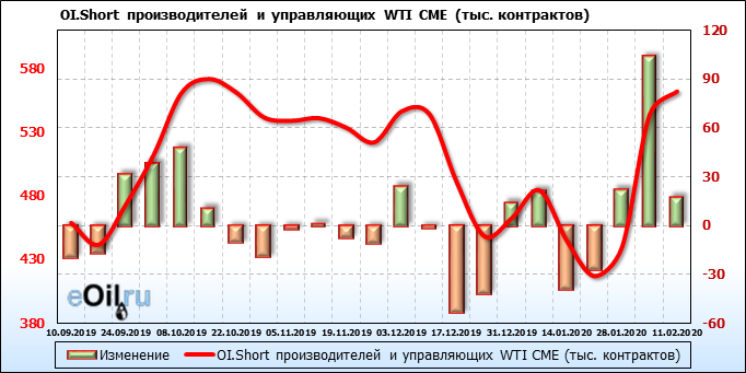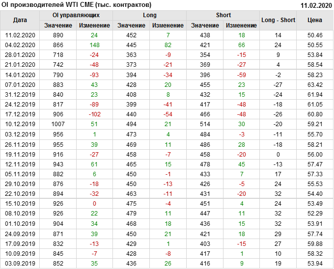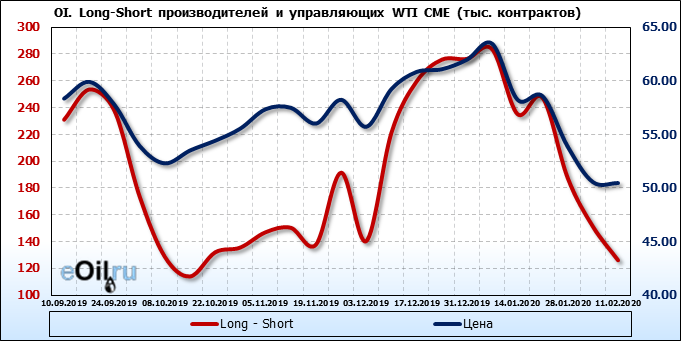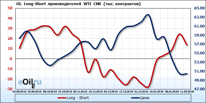 За прошлую неделю, 05.02.20 — 11.02.20, разница между длинными и короткими позициями производителей упала на 11 тыс. контрактов. В тоже время, цена упала на 0.09 доллара. Производители наращивают короткие позиции, что не дает цене расти. В такой ситуации на рынке возможно ускорение падения цен.
