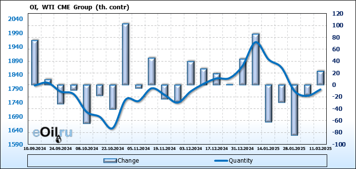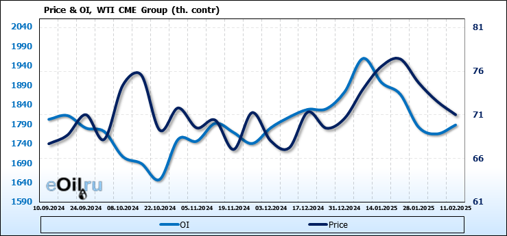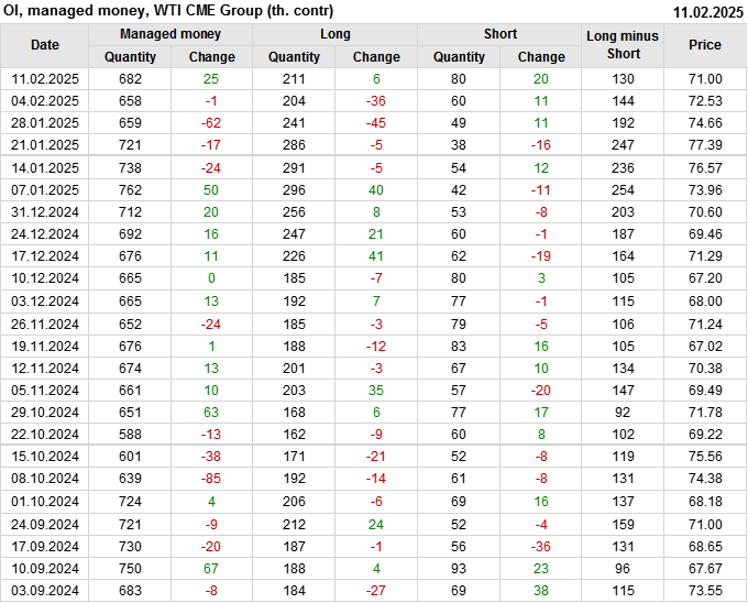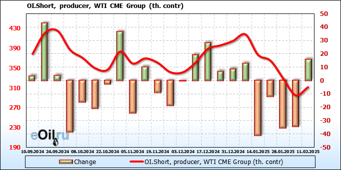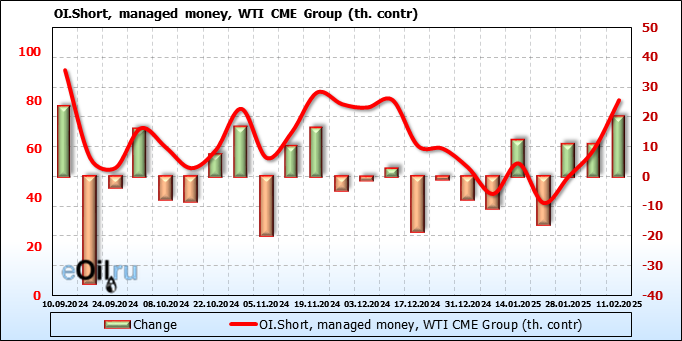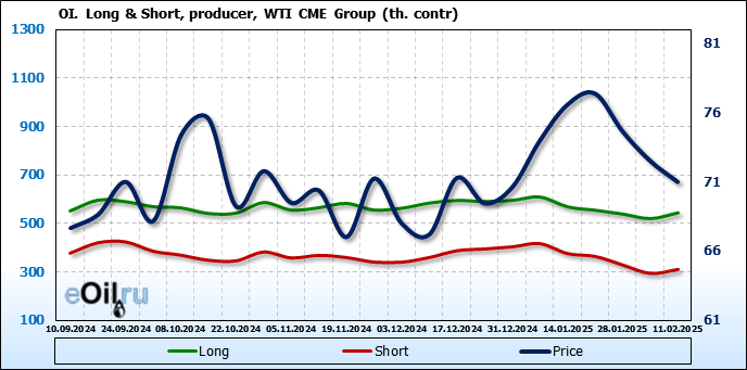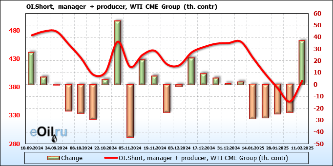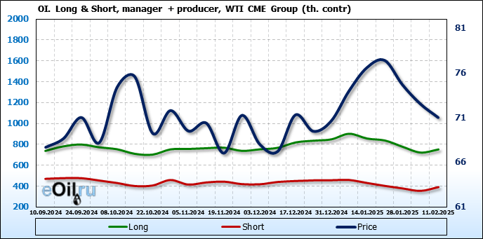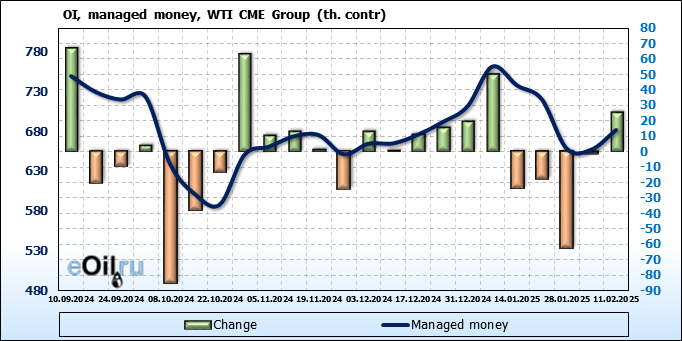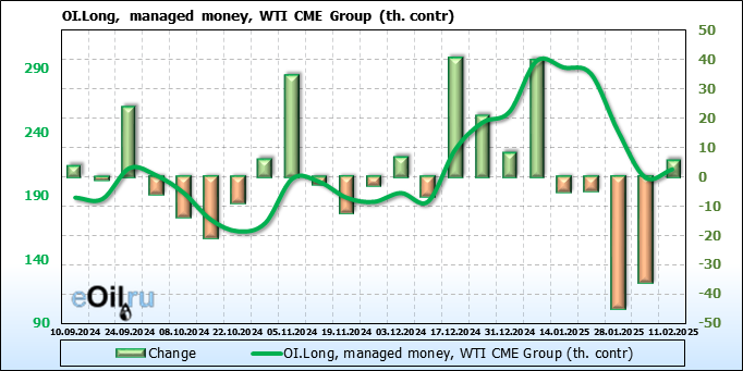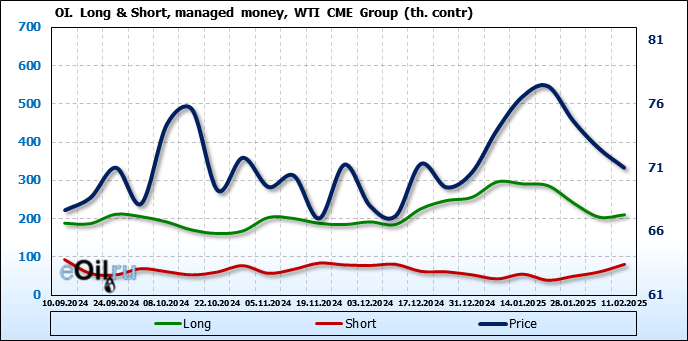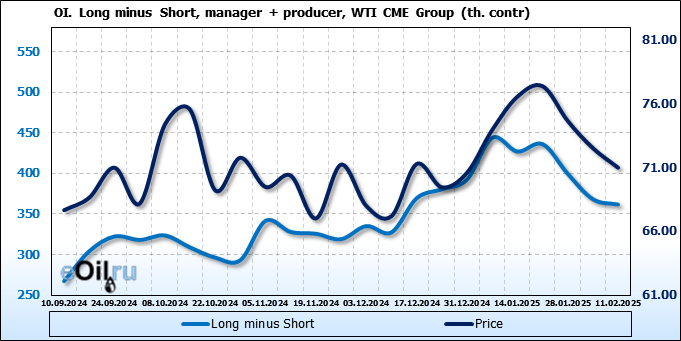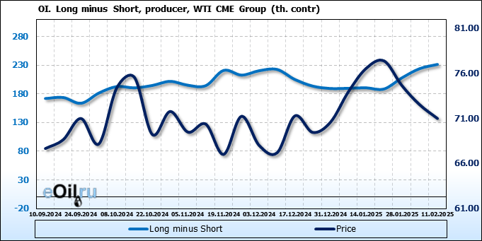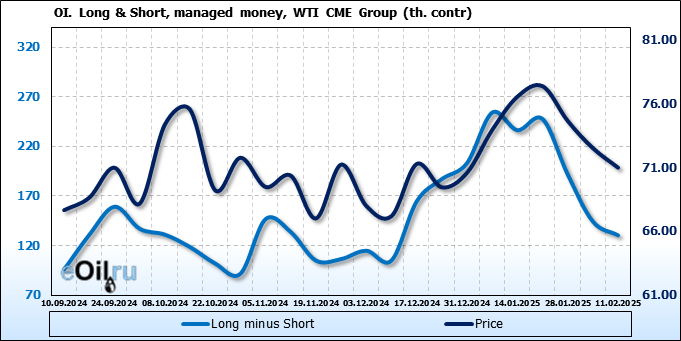 За прошлую неделю, 05.02.25 — 11.02.25, разница между длинными и короткими позициями управляющих сократилась на 13.8 тыс. контрактов. В тоже время, цена упала на 1.53 доллара.