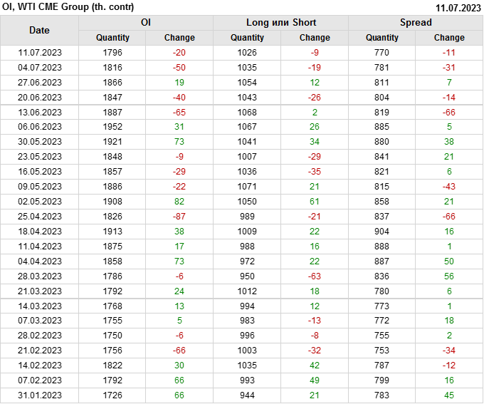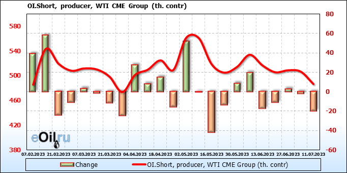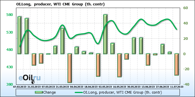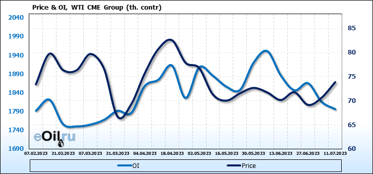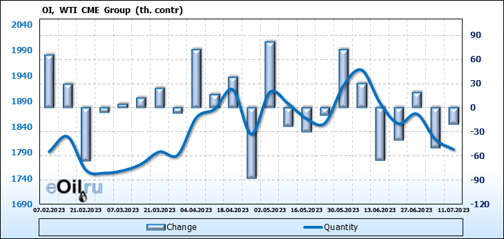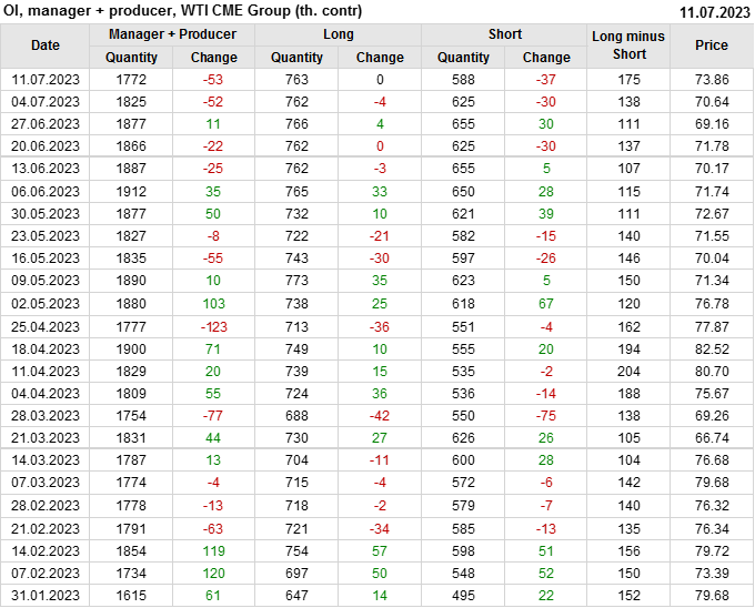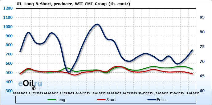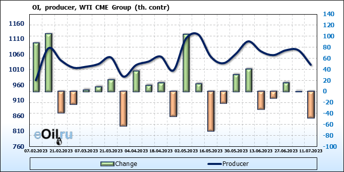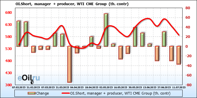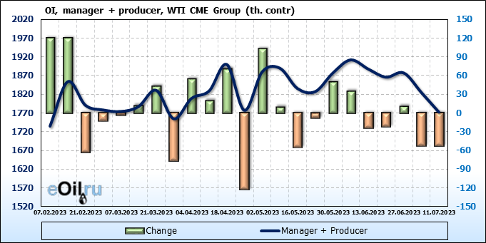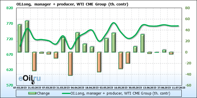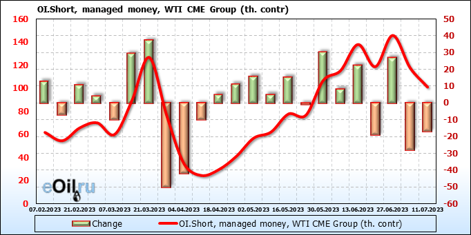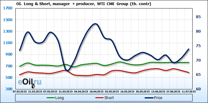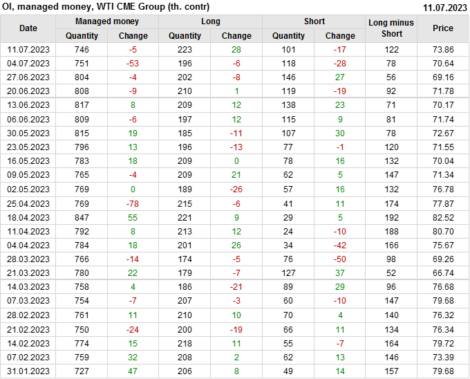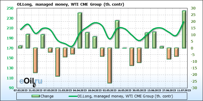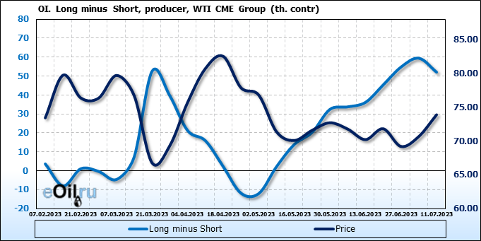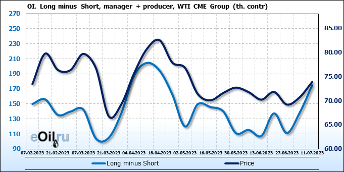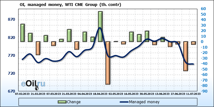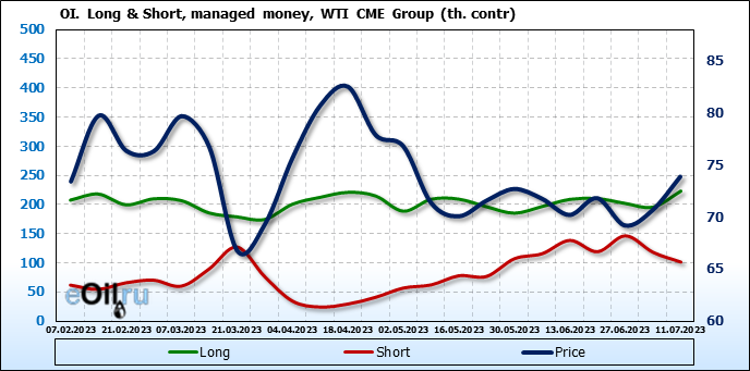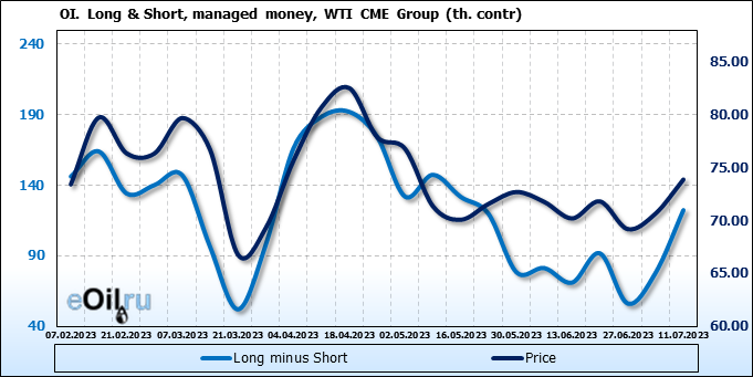 За прошлую неделю, 05.07.23 — 11.07.23, разница между длинными и короткими позициями управляющих увеличилась на 44.3 тыс. контрактов. В тоже время, цена выросла на 3.22 доллара.