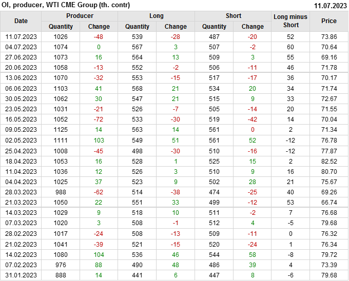 За неделю разница между длинными и короткими позициями производителей сократилась на 7.4 тыс. контрактов.