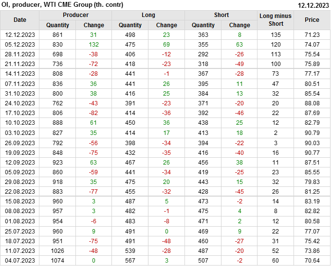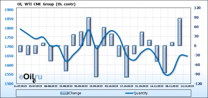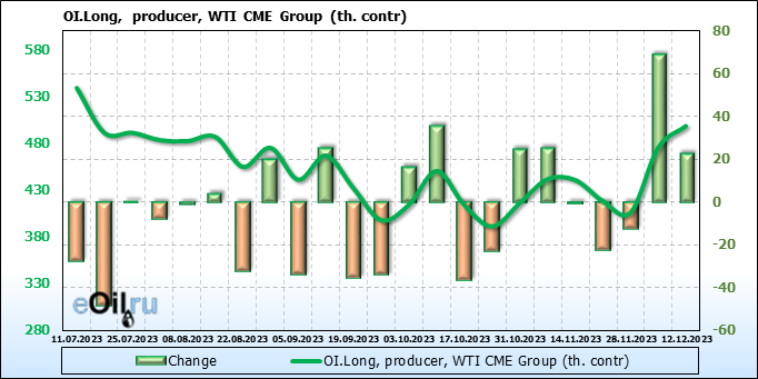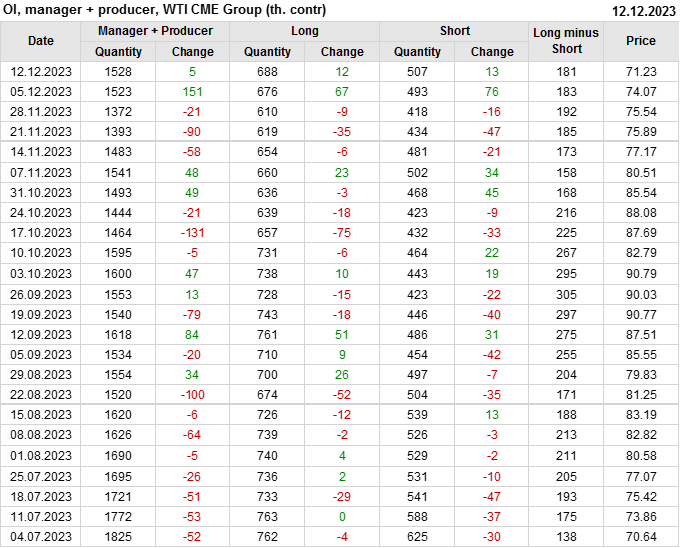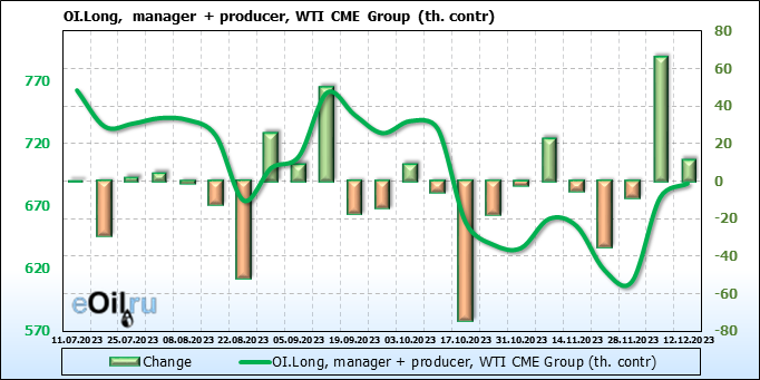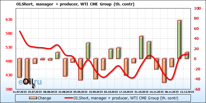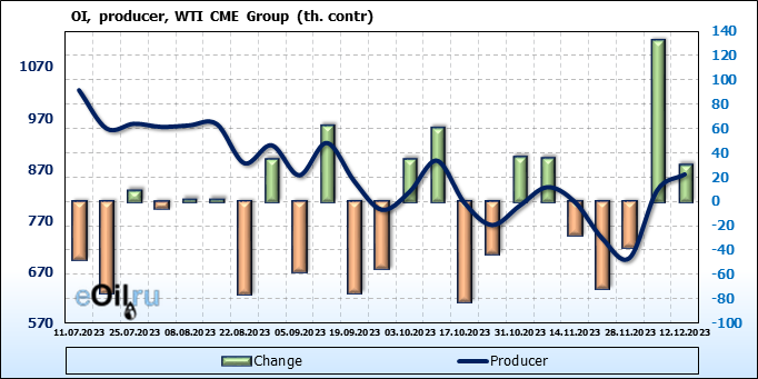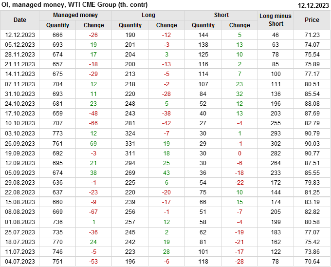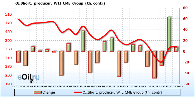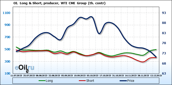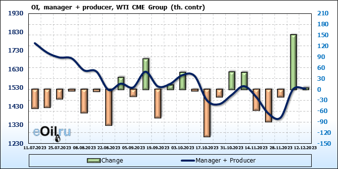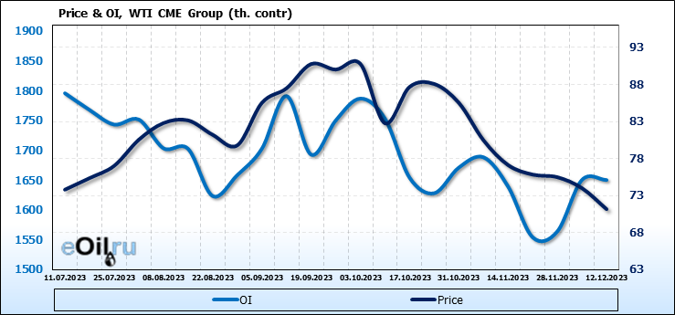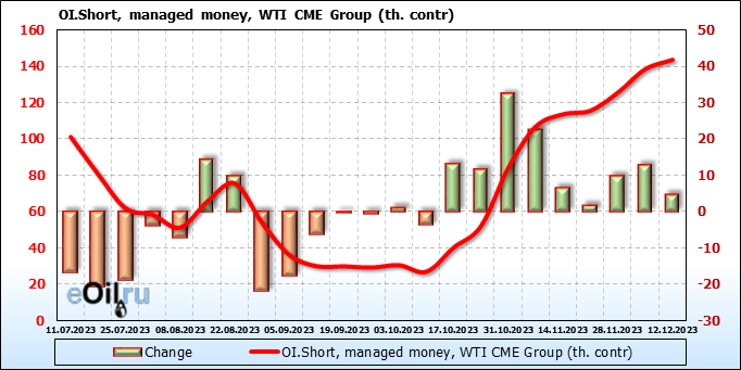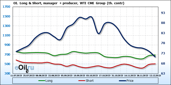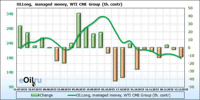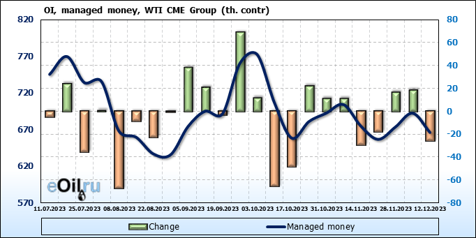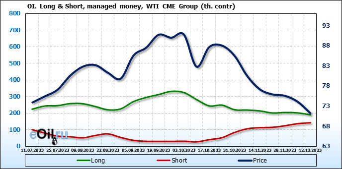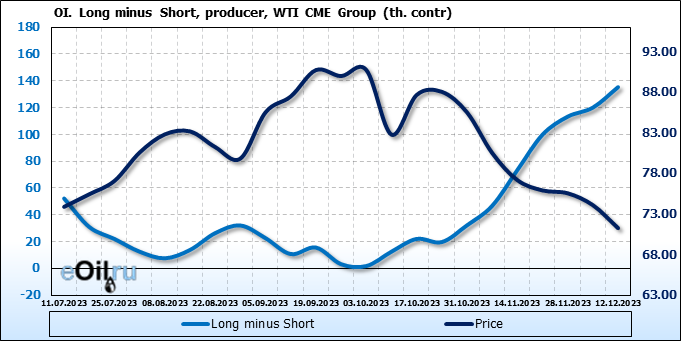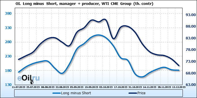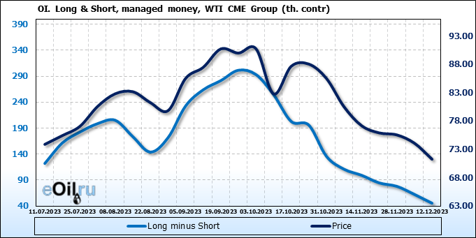 За прошлую неделю, 06.12.23 — 12.12.23, разница между длинными и короткими позициями управляющих сократилась на 16.9 тыс. контрактов. В тоже время, цена упала на 2.84 доллара.