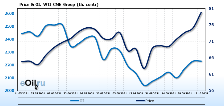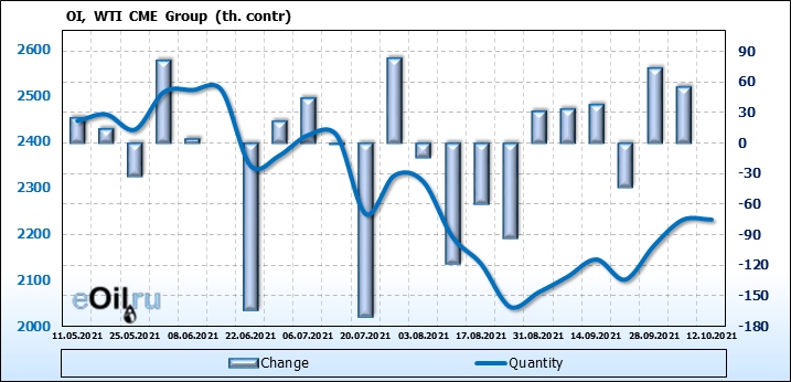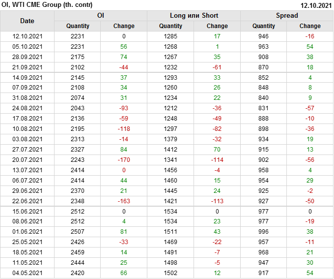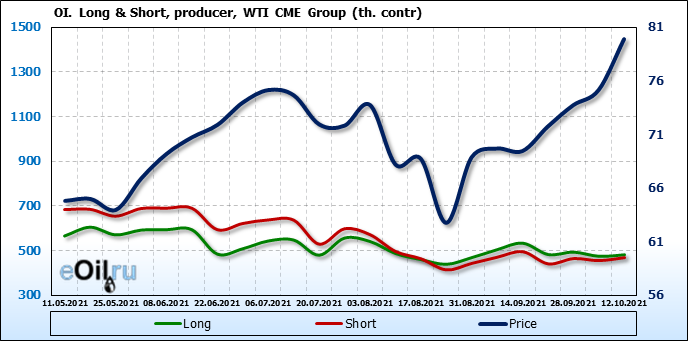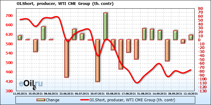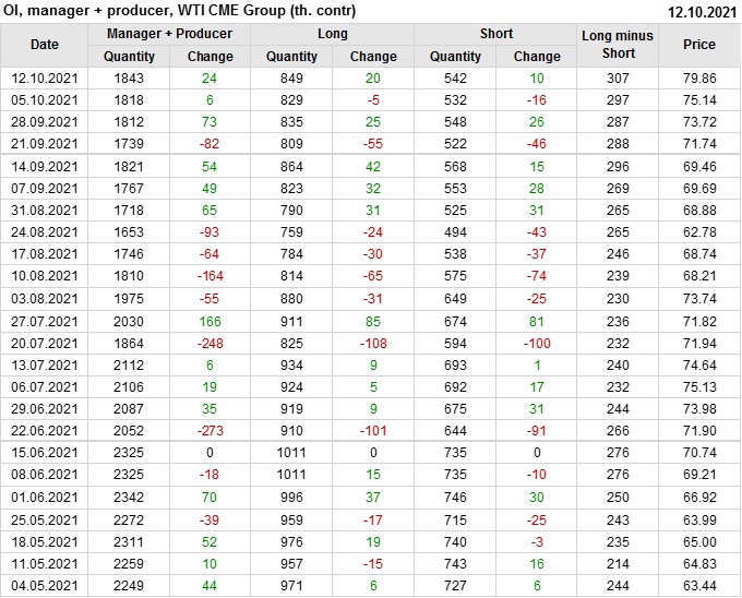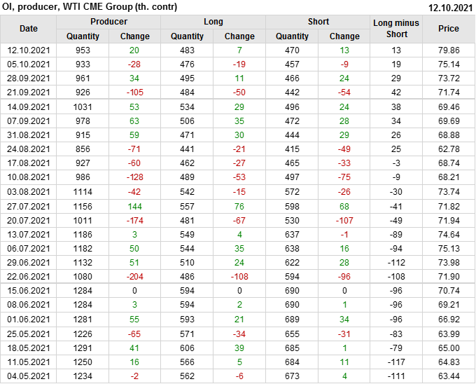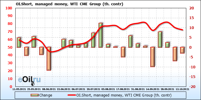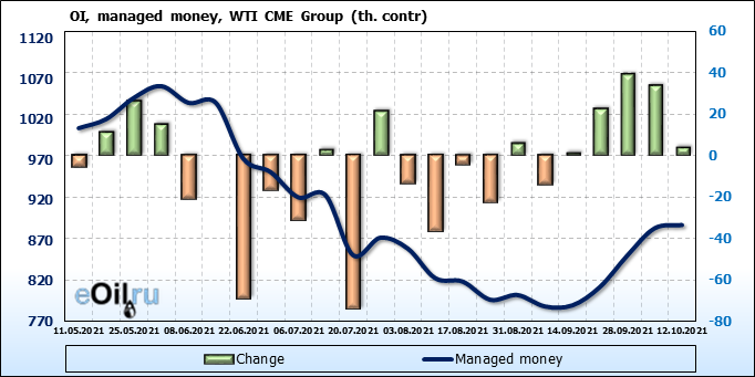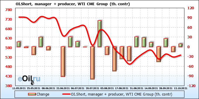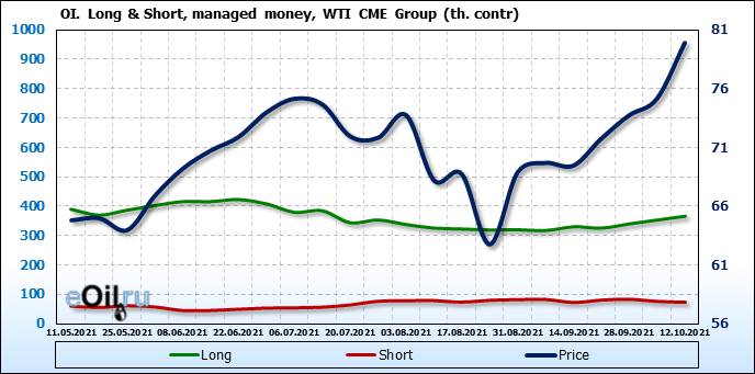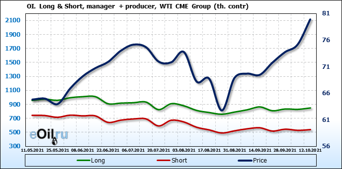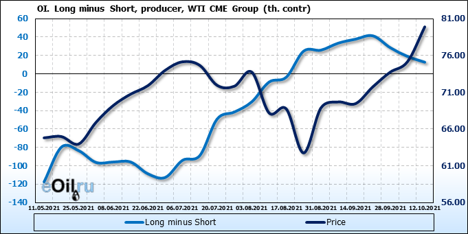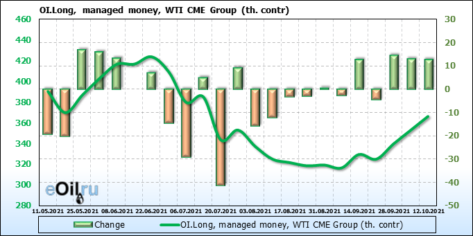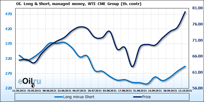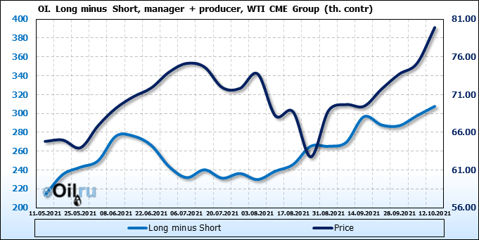 За прошлую неделю, 06.10.21 — 12.10.21, разница между длинными и короткими позициями управляющих увеличилась на 16 тыс. контрактов. В тоже время, цена выросла на 4.72 доллара.