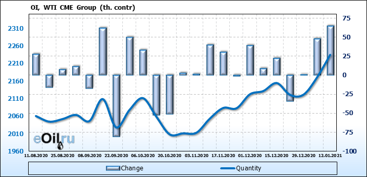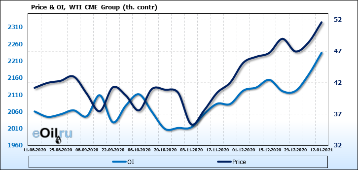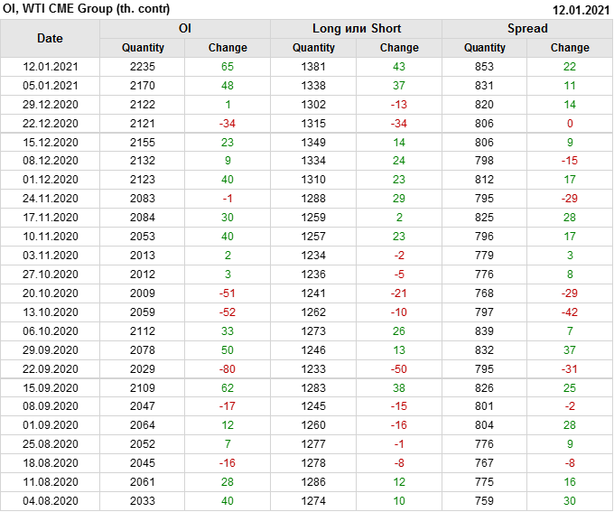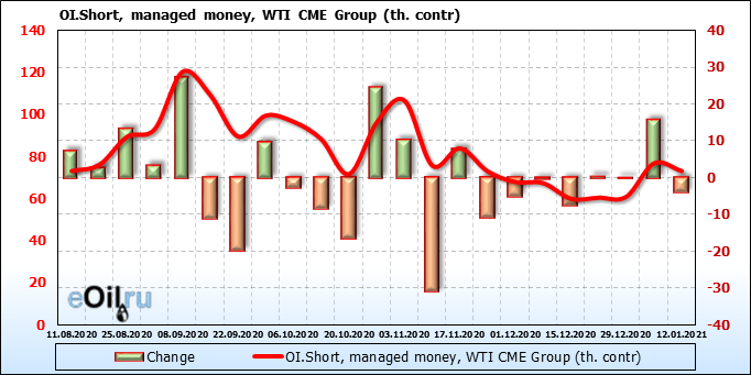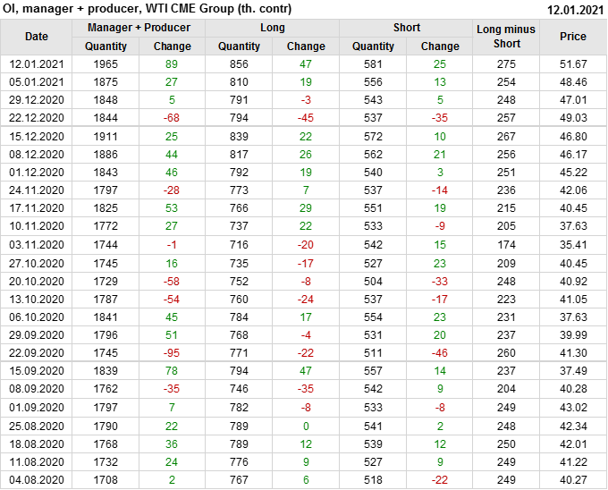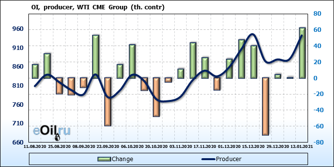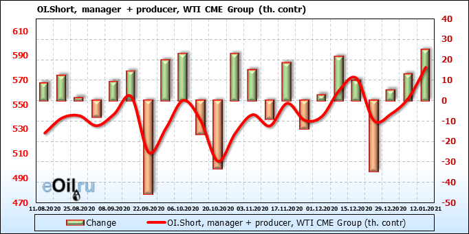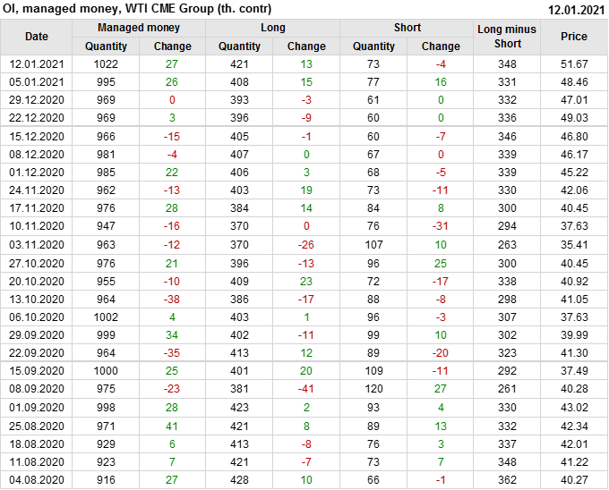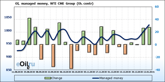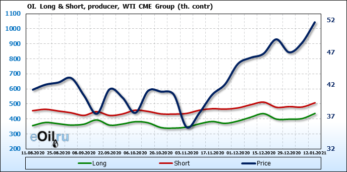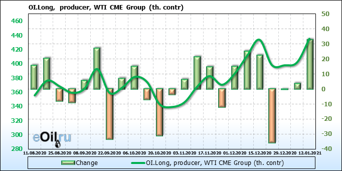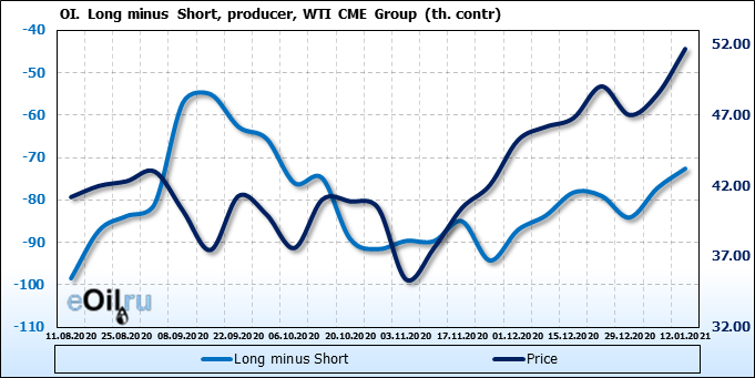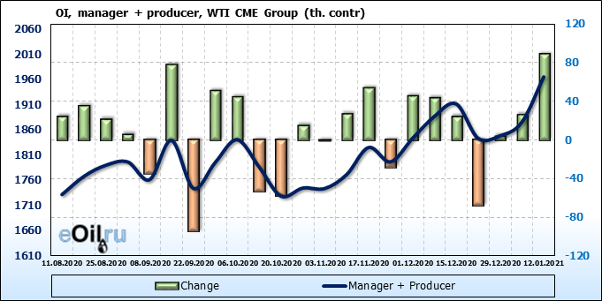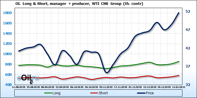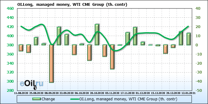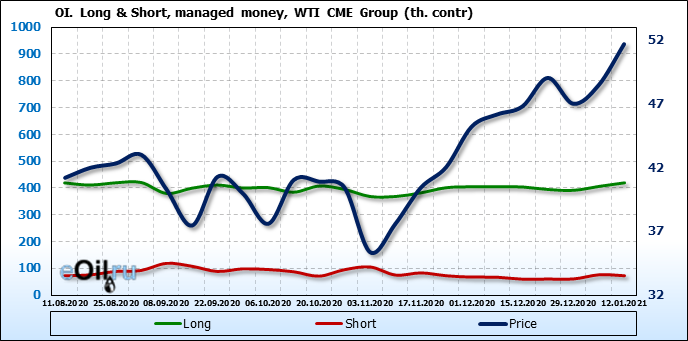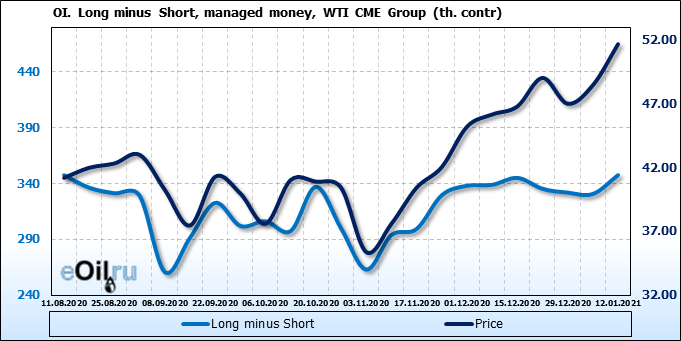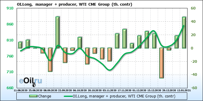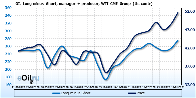 За прошлую неделю, 06.01.21 — 12.01.21, разница между длинными и короткими позициями управляющих выросла на 17 тыс. контрактов. В тоже время, цена выросла на 3.21 доллара. Управляющие наращивают позиции, разгоняя тем самым рост цен, что говорит нам о текущей силе рынка.