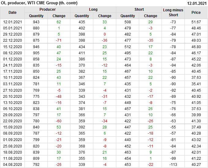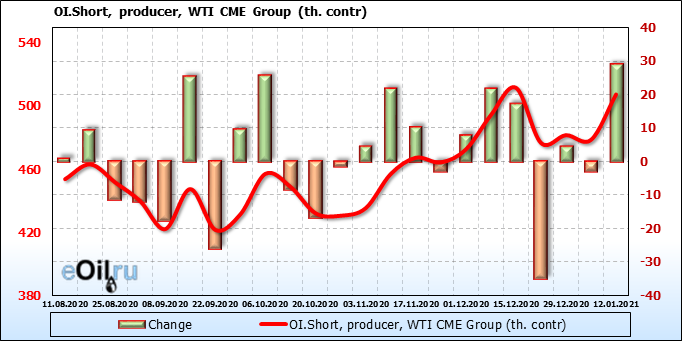 За прошлую неделю, 06.01.21 — 12.01.21, разница между длинными и короткими позициями производителей выросла на 5 тыс. контрактов. В тоже время, цена выросла на 3.21 доллара. Производители не торопятся наращивать продажи, предполагая, что возможен рост цены в ближайшее время.