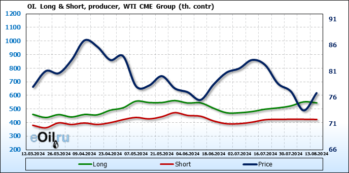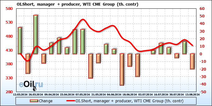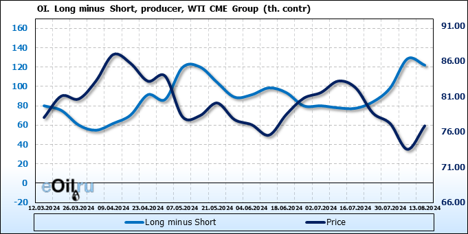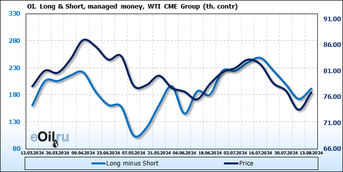 За прошлую неделю, 07.08.24 — 13.08.24, разница между длинными и короткими позициями управляющих увеличилась на 19.1 тыс. контрактов. В тоже время, цена выросла на 3.32 доллара.