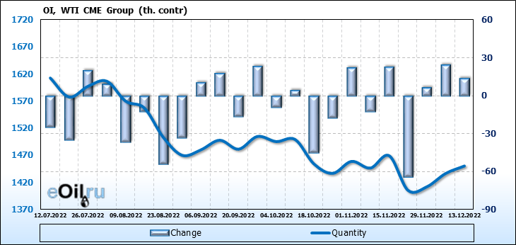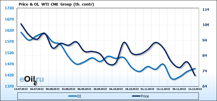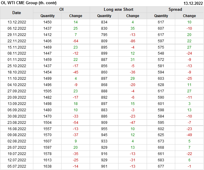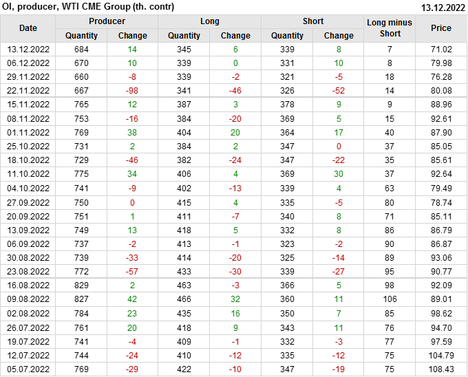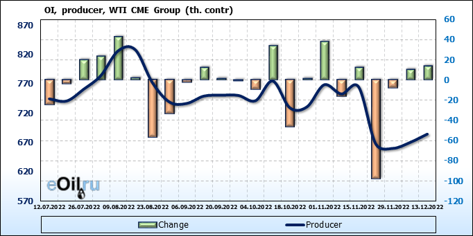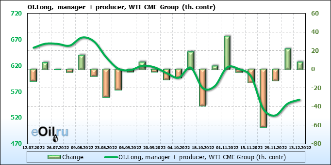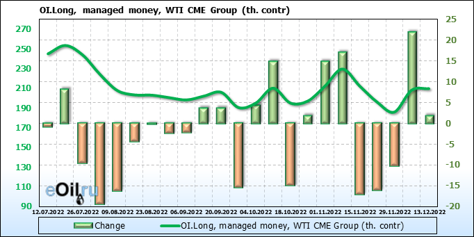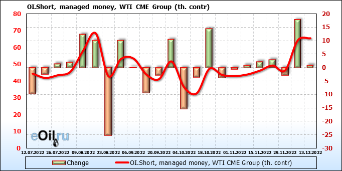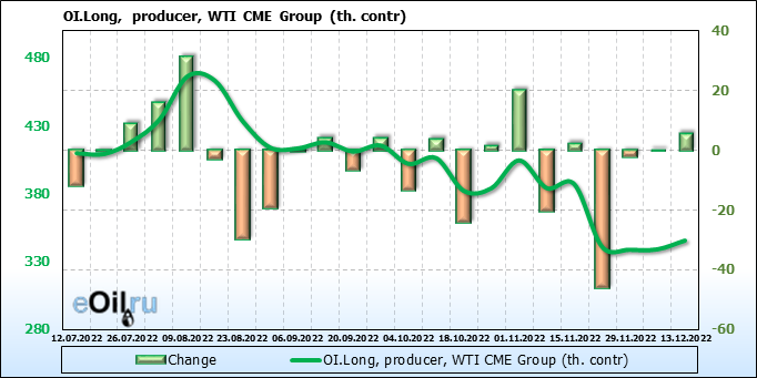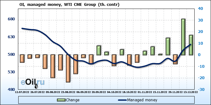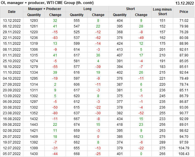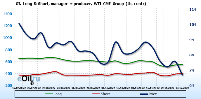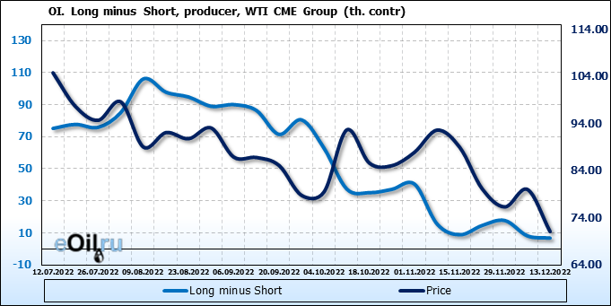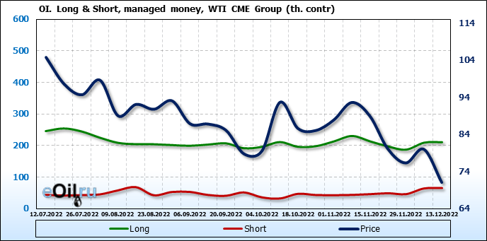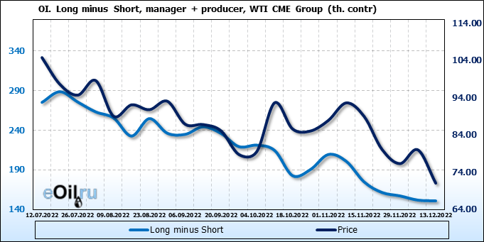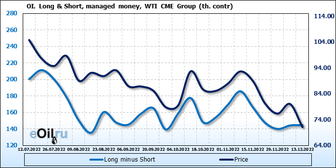 За прошлую неделю, 07.12.22 — 13.12.22, разница между длинными и короткими позициями управляющих увеличилась на 0.4 тыс. контрактов. В тоже время, цена упала на 8.96 доллара.