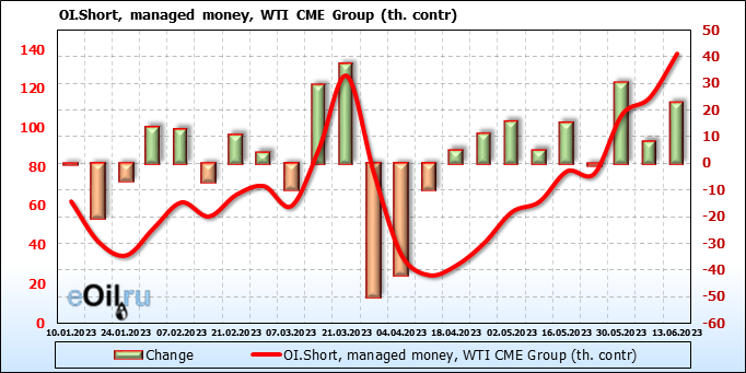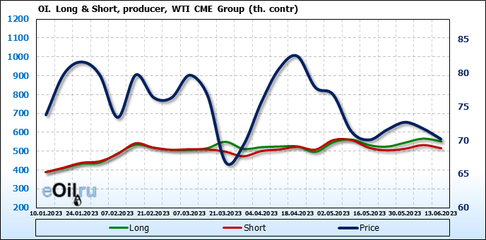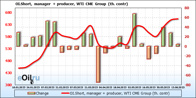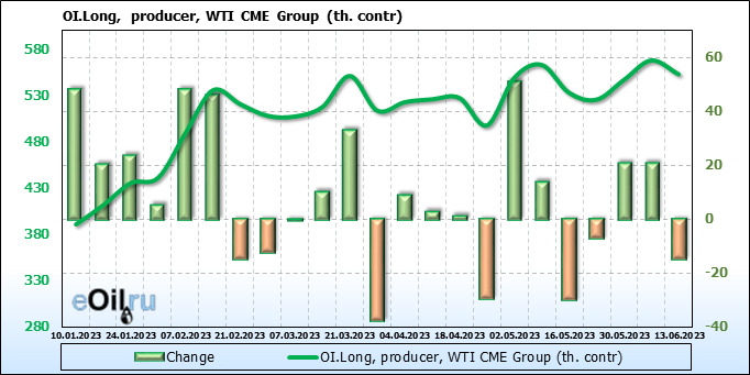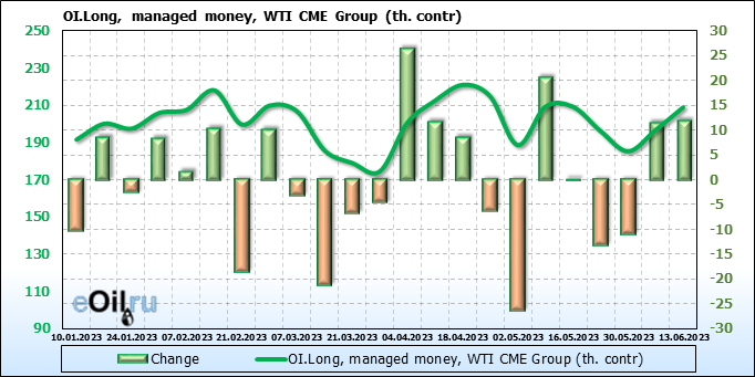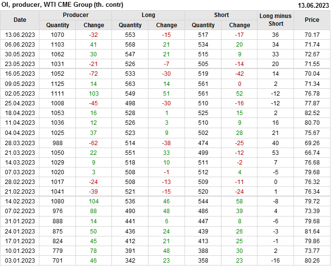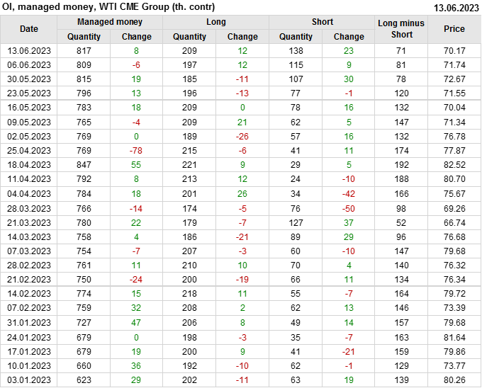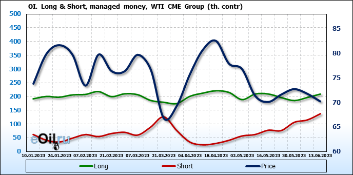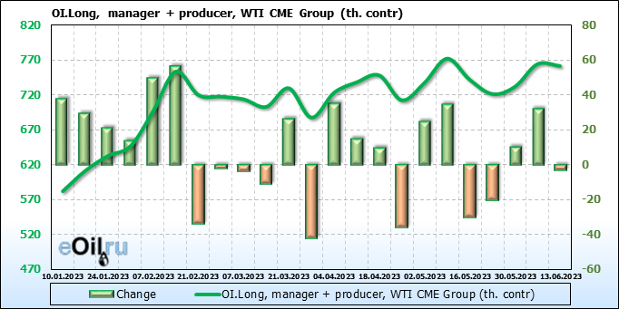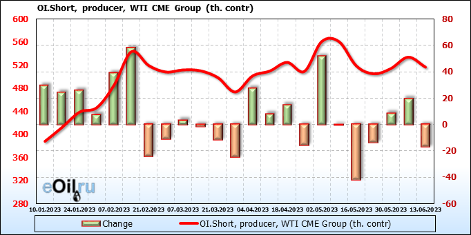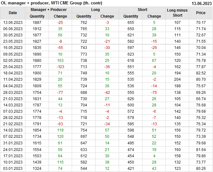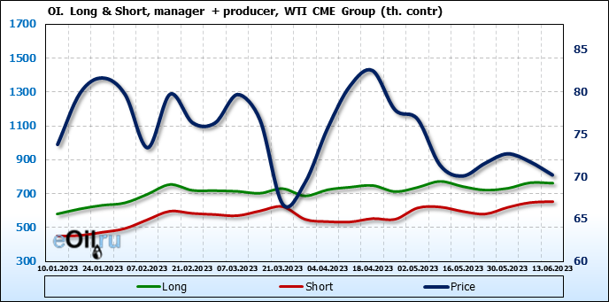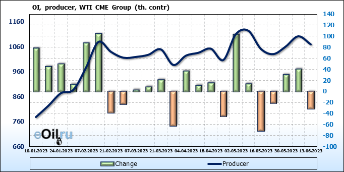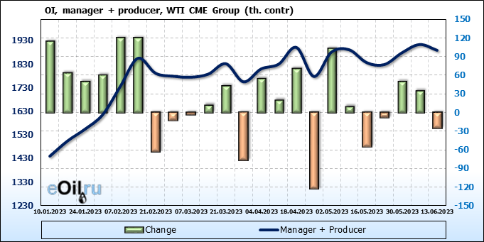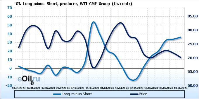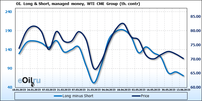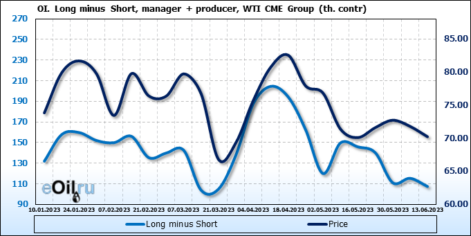 За прошлую неделю, 07.06.23 — 13.06.23, разница между длинными и короткими позициями управляющих сократилась на 10.3 тыс. контрактов. В тоже время, цена упала на 1.57 доллара.