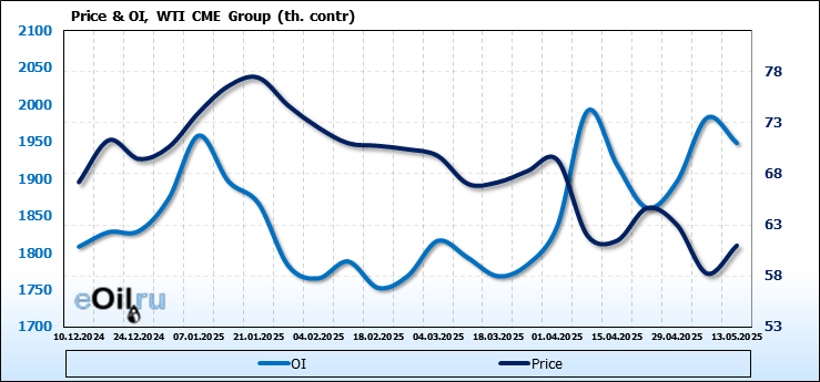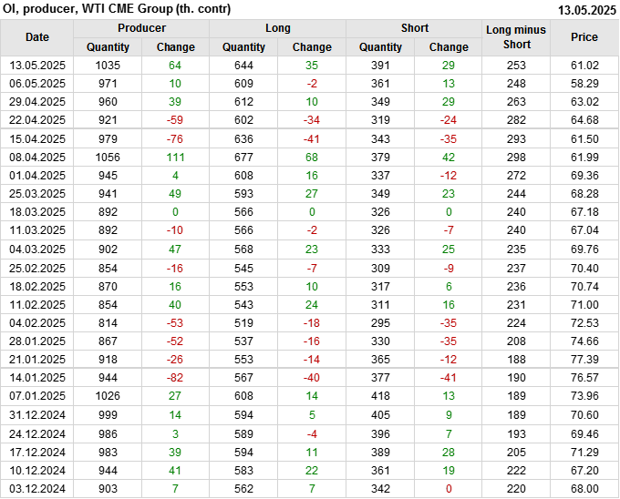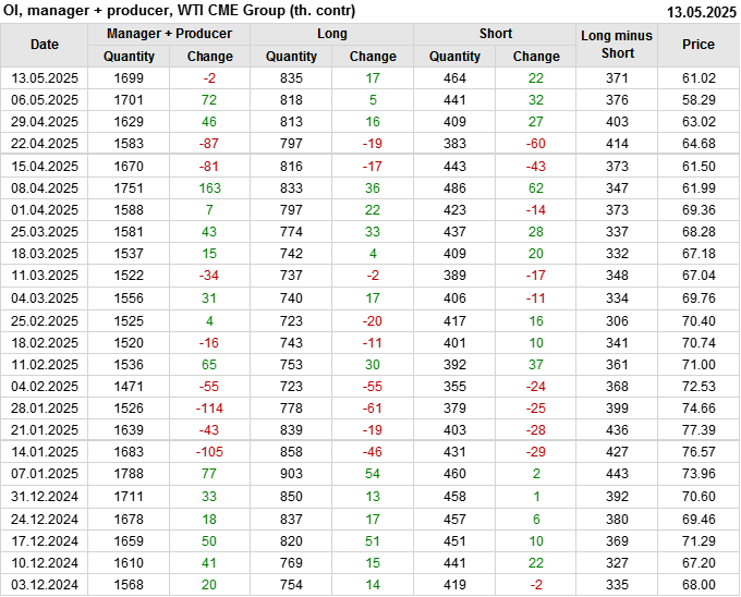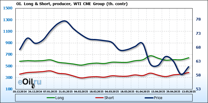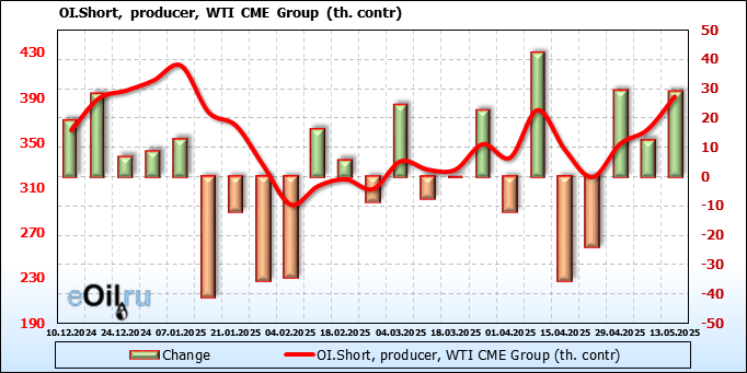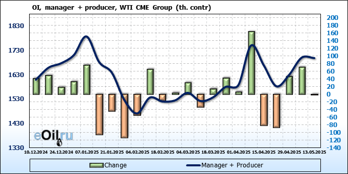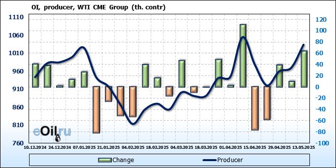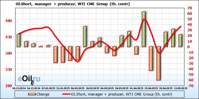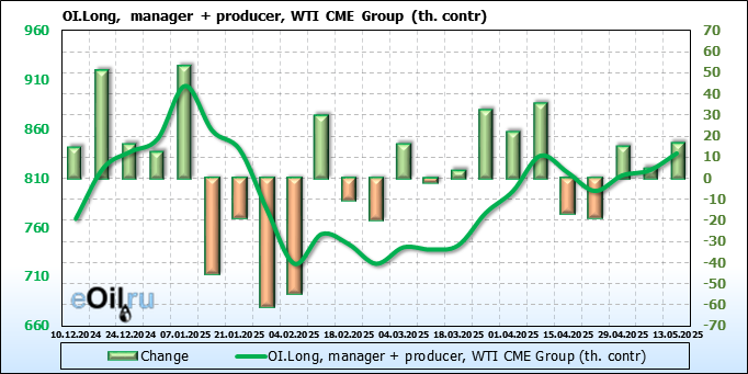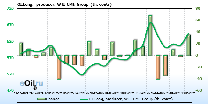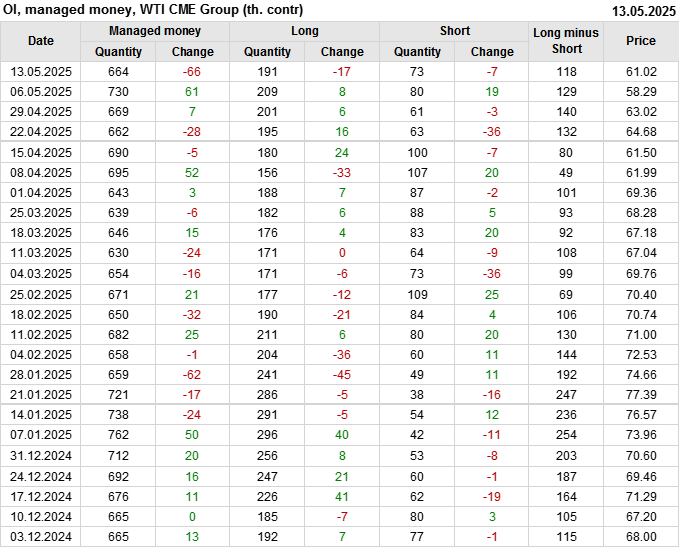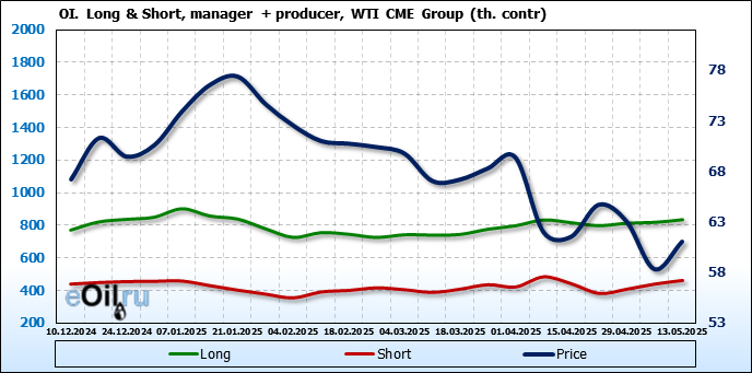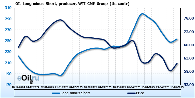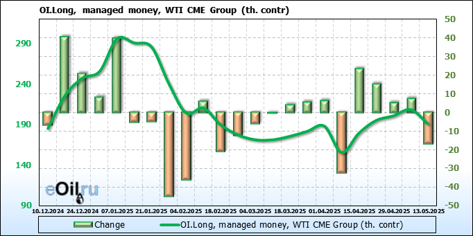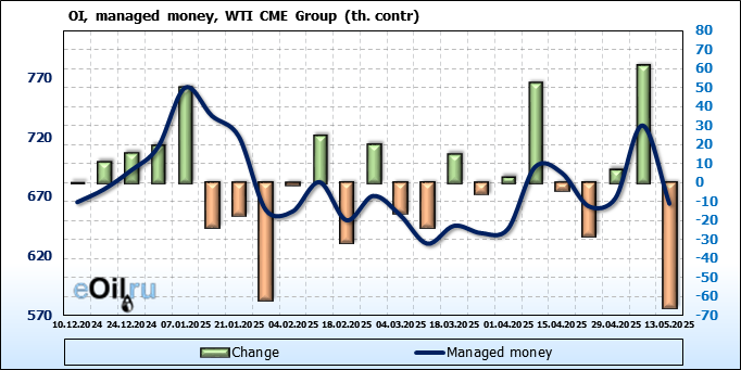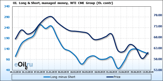 За прошлую неделю, 07.05.25 — 13.05.25, разница между длинными и короткими позициями управляющих сократилась на 10.5 тыс. контрактов. В тоже время, цена выросла на 2.73 доллара.